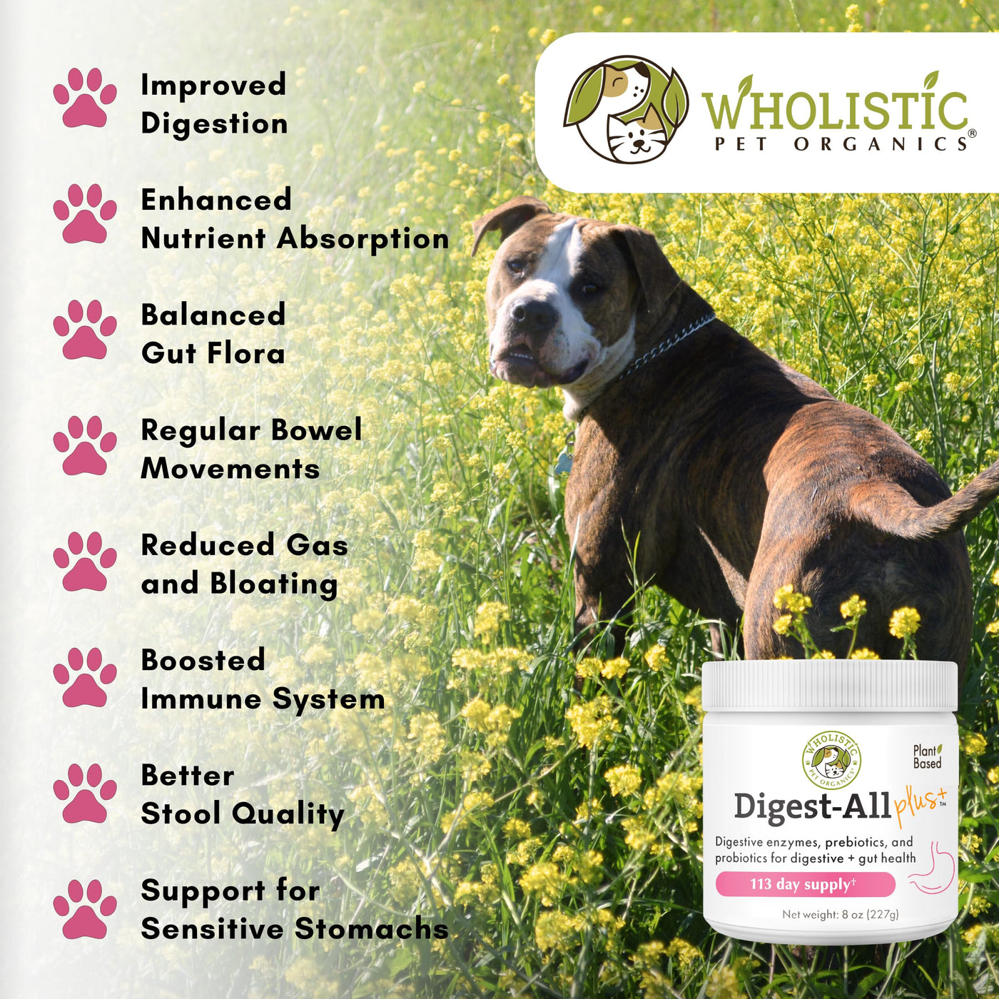 Wholistic Pet Organics Probiotics for Dogs with Digestive Enzymes & Prebiotic Fiber - 8 Oz - Daily Cat & Dog Probiotics for Digestive Health, Anti Diarrhea & Gut Support - Natural Powder Supplement