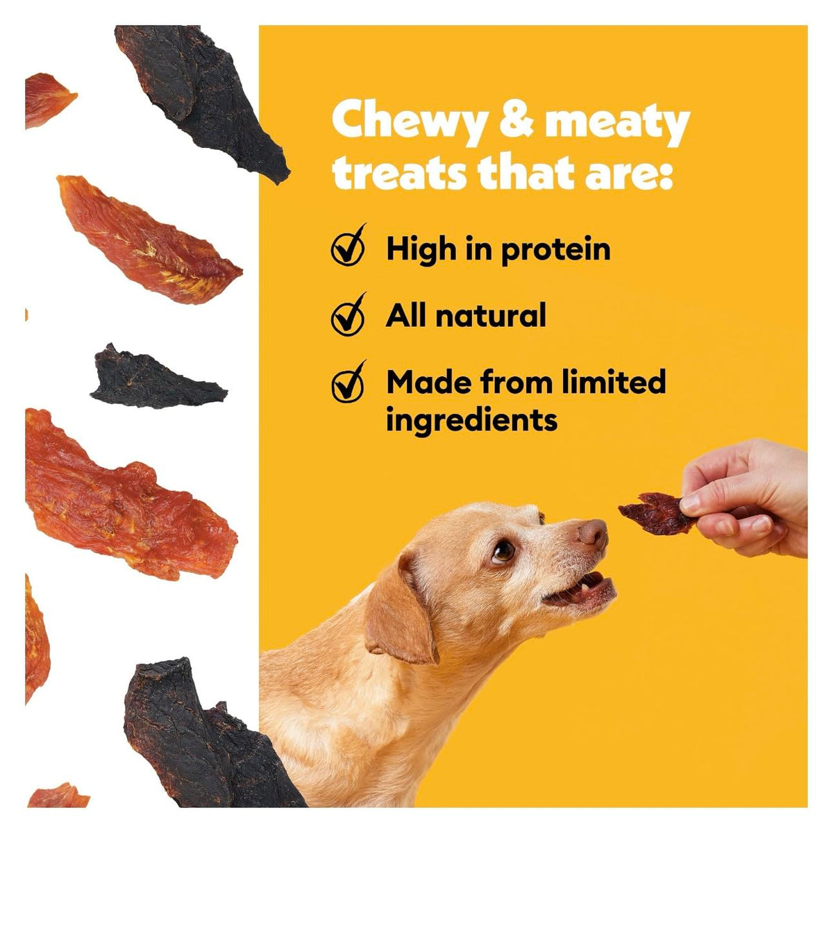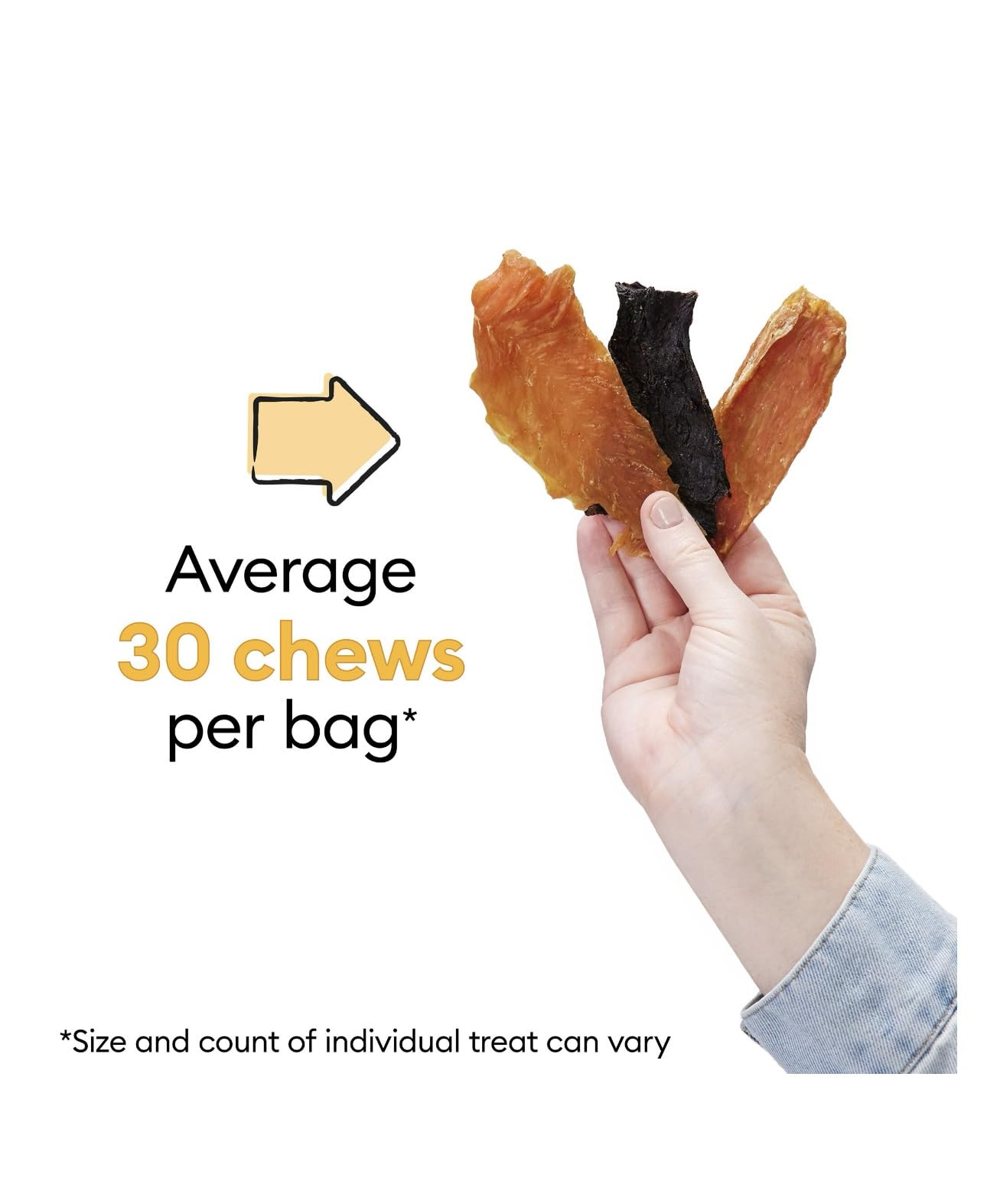 Treat your furry friend to a premium jerky experience with these delectable Wiggles & Wags Jerky Cuts. This generous 16-ounce package features an assorted variety of chicken, tuna, and pork jerky treats that will keep your dogs tail wagging with excitement. Each piece is carefully prepared to provide a satisfying texture that dogs love to chew. The mix of protein sources offers different flavors to keep your pet engaged and interested. These treats come in a convenient resealable bag to maintain freshness, making them perfect for training sessions or as special rewards throughout the day. The package includes a bonus random color DN Essentials bone-shaped waste bag dispenser and a complimentary roll of bags, adding extra value to this tasty treat package. These jerky cuts are sized appropriately for most dogs, making them an excellent choice for treating your four-legged companion.
