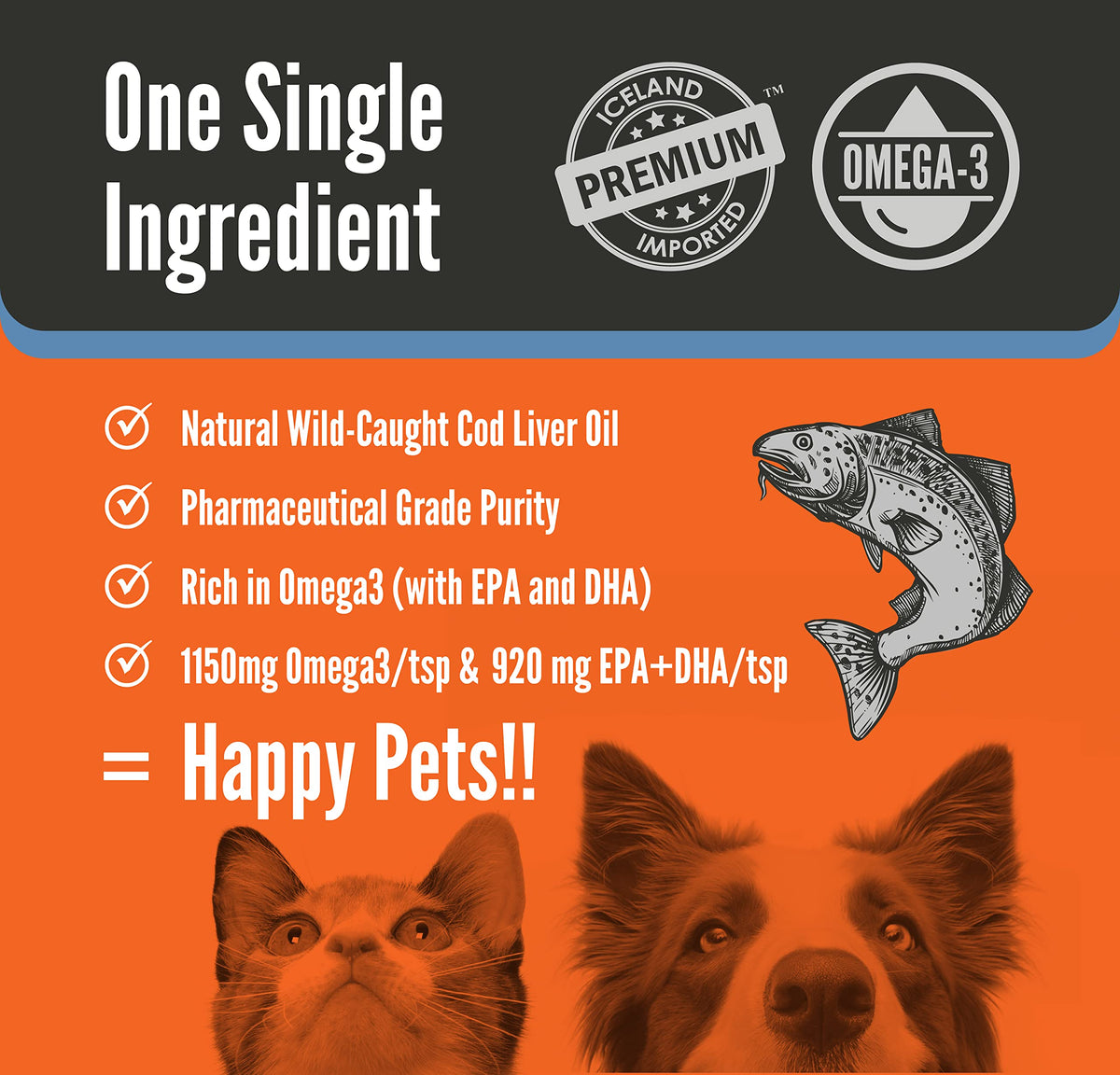 HIGHEST PURITY & QUALITY Cod Liver Oil available for dogs and cats. A pharmaceutical grade fish oil with the highest Omega 3 levels, EPA/DHA and lowest moisture of any cod liver oil on the market. Leak-free pump bottle ensures correct dosage levels every time. Regular supplementation supports heart, joint and immune system wellness, reduces inflammation, improves skin and coat, and promotes brain function. Single ingredient, preservative-free oil and extracted from sustainably caught Wild Icelandic Cod, which is rich in essential Omega-3, EPA, and DHA. Give your pets the best possible nutrition. Dont settle for less! Suitable for dogs and cats of all ages, stages, breeds, and sizes, this premium pet supplement will result in a healthy pet and happy pet parents!