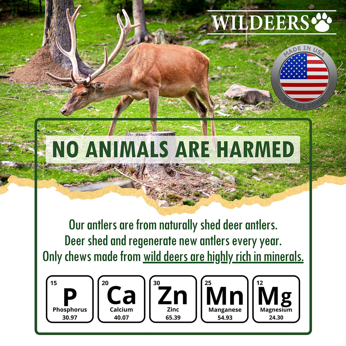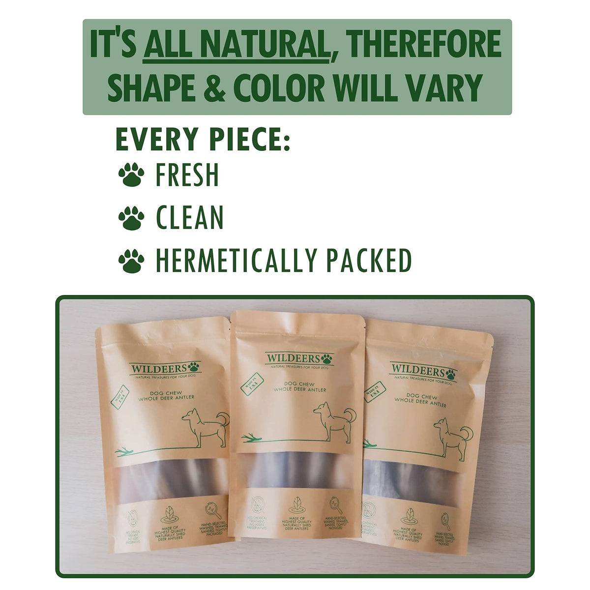 Do you LOVE dogs like we do? If the answer is YES (We hope it is), you should know that we would like to give YOUR PET only PREMIUM QUALITY antler bones for dogs, which are specially selected from Heartland Antlers. Our antlers are big and hard enough for your pet safety. Do you care about nature? Wildeers brand was created by people who care about all livings. During the production process no animals are harmed. Remember, just antlers naturally shed are rich in minerals which are the biggest value of this treat. Buying from us, you can be sure that this product is the highest quality on the market. They help your pet to keep his teeth and mind in awesome condition Since our antlers are never farm raised they do not contain steroids, antibiotics, preservatives or any artificial additives. Be careful with similar products, which are soft toothpicks and can be harmful for your pet. What will you get? Buying from us you will get 3 pieces of 7-9 inches long whole deer antler for dogs (depends on selected variation). Please choose right size for your breed and weight. Dont worry when your pet breaks the antler, it is natural. Antlers are very hard but they are not indestructible. Always watch your pet while they enjoy this treat to prevent injury and choking hazard. Some aggressive chewers may be able to chew an antler into small bits, pieces or shards. If this occurs, those pieces and the antler should immediately be discarded. Make your dog happy today - Click the ADD TO CART Button above!