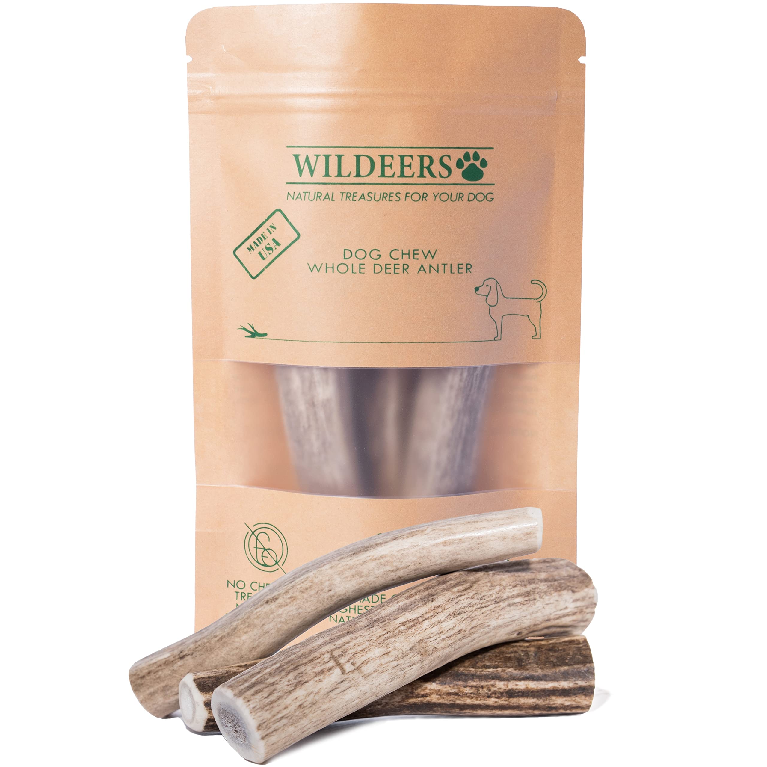 Do you LOVE dogs like we do? If the answer is YES (We hope it is), you should know that we would like to give YOUR PET only PREMIUM QUALITY antler bones for dogs, which are specially selected from Heartland Antlers. Our antlers are big and hard enough for your pet safety. Do you care about nature? Wildeers brand was created by people who care about all livings. During the production process no animals are harmed. Remember, just antlers naturally shed are rich in minerals which are the biggest value of this treat. Buying from us, you can be sure that this product is the highest quality on the market. They help your pet to keep his teeth and mind in awesome condition Since our antlers are never farm raised they do not contain steroids, antibiotics, preservatives or any artificial additives. Be careful with similar products, which are soft toothpicks and can be harmful for your pet. What will you get? Buying from us you will get 3 pieces of 4-5 inches long whole deer antler for dogs (depends on selected variation). Please choose right size for your breed and weight. Dont worry when your pet breaks the antler, it is natural. Antlers are very hard but they are not indestructible. Always watch your pet while they enjoy this treat to prevent injury and choking hazard. Some aggressive chewers may be able to chew an antler into small bits, pieces or shards. If this occurs, those pieces and the antler should immediately be discarded. Make your dog happy today - Click the ADD TO CART Button above!