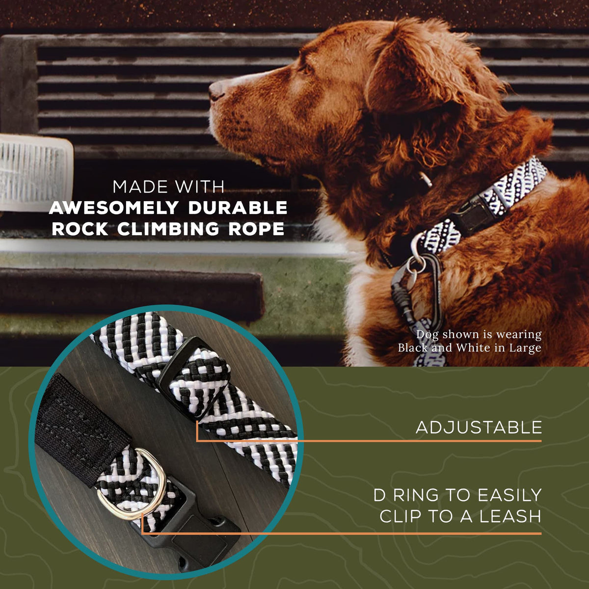 Super durable rope dog collar backed by a lifetime warranty of adventures - never buy another collar again! Your dog doesnt mess around when it comes to exploring and neither should their gear. Made with durable rock climbing rope trusted by climbers and heavy-duty hardware - youll have the strongest collar out there.