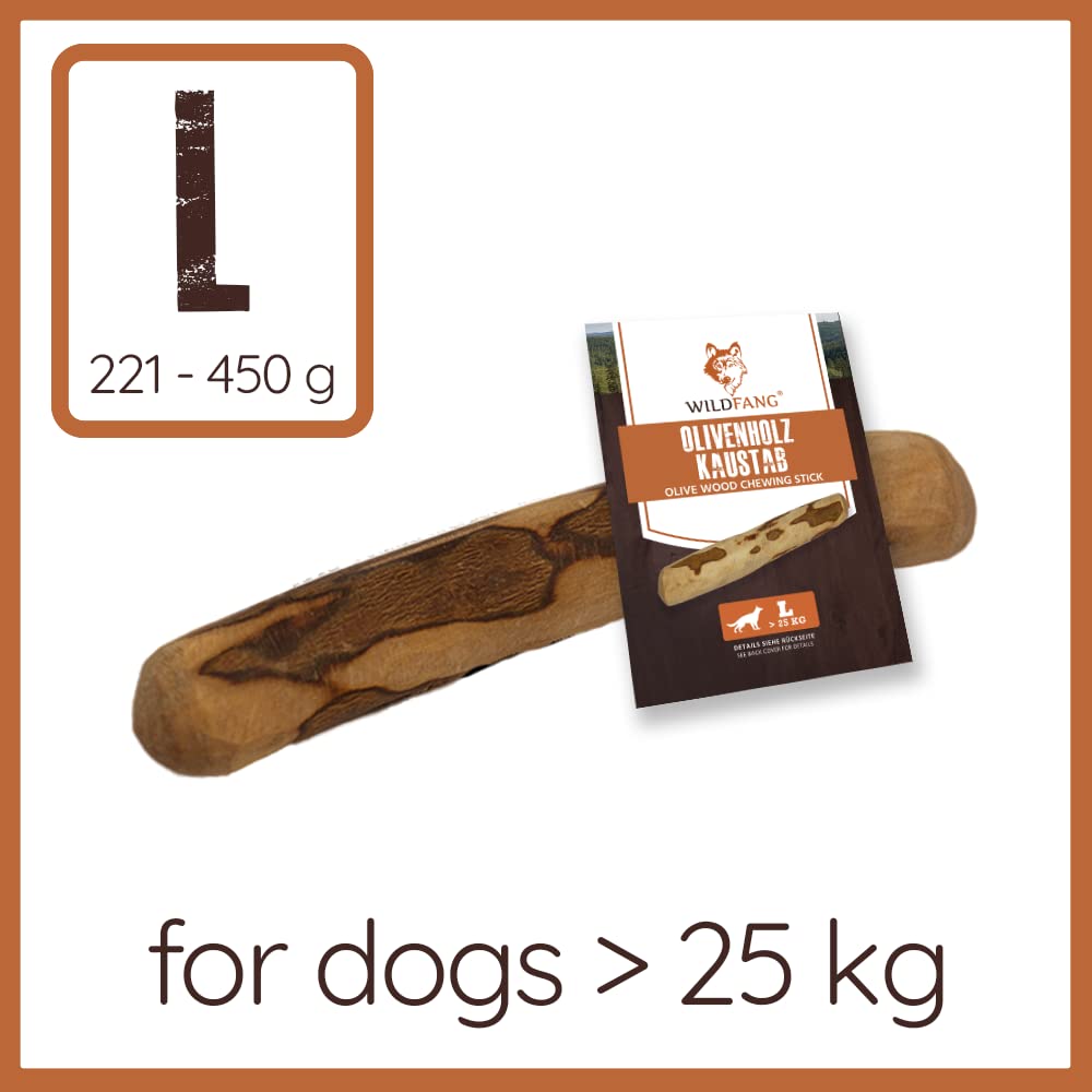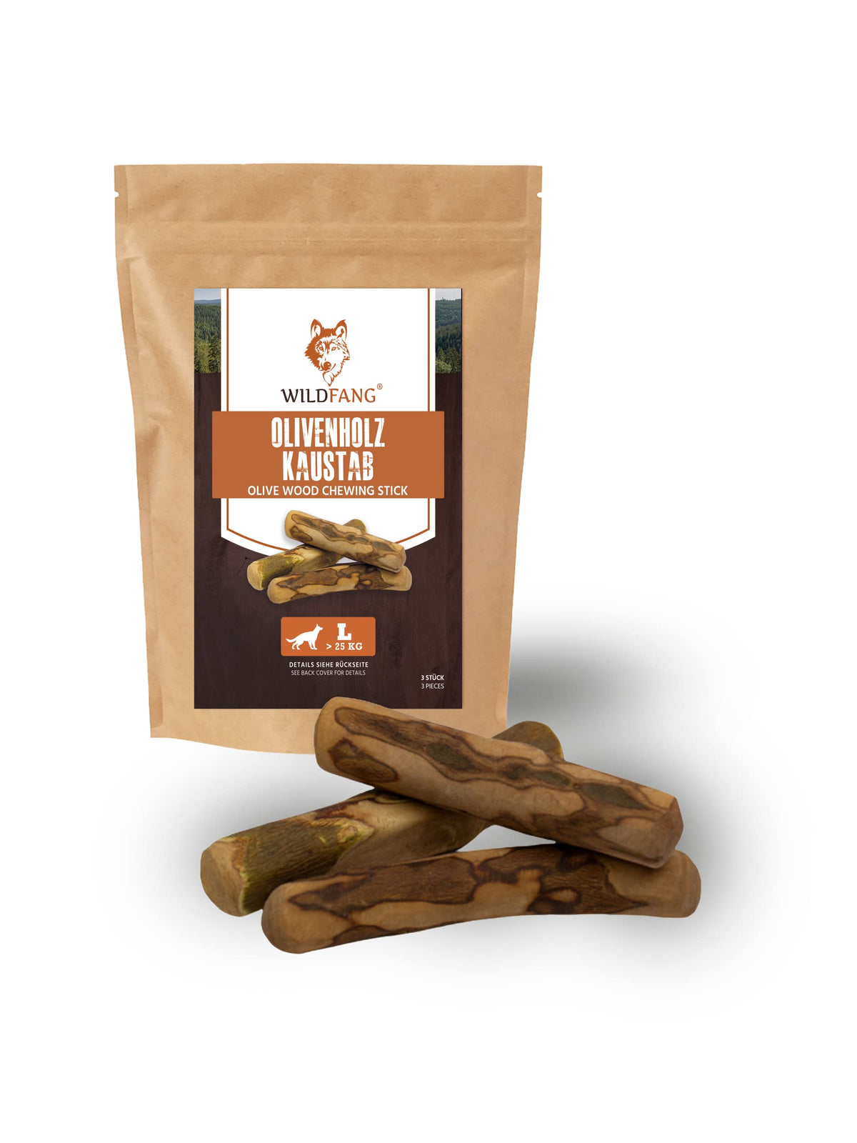 Wildfang olive wood is carefully selected, checked and then dried, cut and polished individually in a quality control process to avoid risks. To increase the attractiveness of the chewing wood, it is soaked in 100% natural olive oil and retains its natural bark. Our olive wood chewing wood is available in three different sizes and is suitable for dogs and puppies of all breeds and sizes. The chewing root is ideal for fetch games and offers your dog plenty of entertainment while relieving stress at the same time. It promotes blood circulation in the gums, dental health and training of the jaw muscles. Dogs love to chew and nibble, regardless of whether they are puppies or adult four-legged friends. Therefore, our olive wood chewing wood offers an attractive taste alternative to our coffee wood for dogs. Chewing on olive wood is safe and pleasant for your dog because it does not splinter, but only frays. The fibers from the wood can be swallowed without hesitation because they are natural and therefore very digestible.