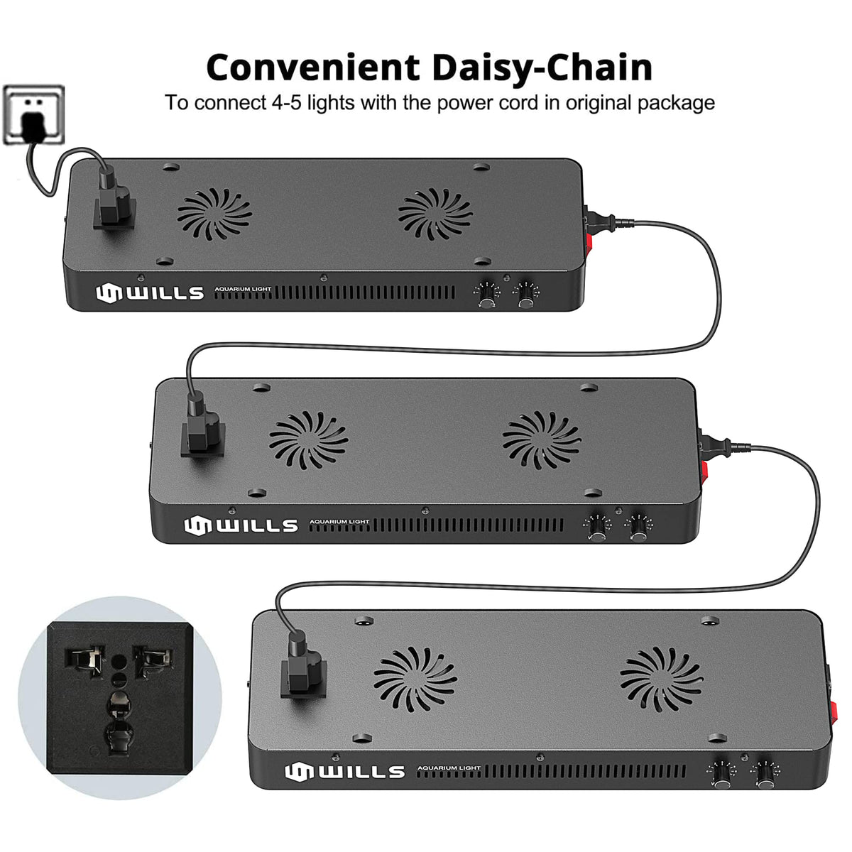 Remote & LED Touch Screen Control - Effortlessly manage on/off, brightness, and lighting modes using the remote or touch panel. Create the perfect aquatic ambiance with ease. Upgrade your aquarium experience today! (Warm Tips: The remote control does not support master-slave group control!) Intense Lighting - Equipped with 55 high-quality SMD chips, the WILLS aquarium light provides intense illumination that effortlessly penetrates the water, reaching every corner, including the sand bed. Enjoy a brightly lit aquatic environment. It is ideal for tanks up to 24 inches deep and holding less than 57 gallons. Covers an area of up to 36' x 36' x 36'. Full Spectrum & Thermometer - This fish tank light features a comprehensive full spectrum design that caters to the specific needs of plants and corals. Experience lush plant growth and vibrant coral colors. Equipped with thermometer allows you to monitor the water temperature in real-time on the LED screen. 3 Dimming Modes & Timer - Easily customize your lighting experience. The aquarium lights for fish tank is equipped with 3 dimming modes and a timer, allowing you to simulate sunrise, sunset, and moonlight effects with 0%-100% dimming to meet the needs of different SPS/LPS corals in your aquarium. Quiet Cooling & Daisy Chain Design - The advanced cooling system of this coral light ensures efficient heat dissipation while maintaining quiet operation. Enjoy a peaceful and comfortable environment for both you and your aquatic inhabitants. The daisy chain design supports connecting up to five aquarium lights using the original power cord.