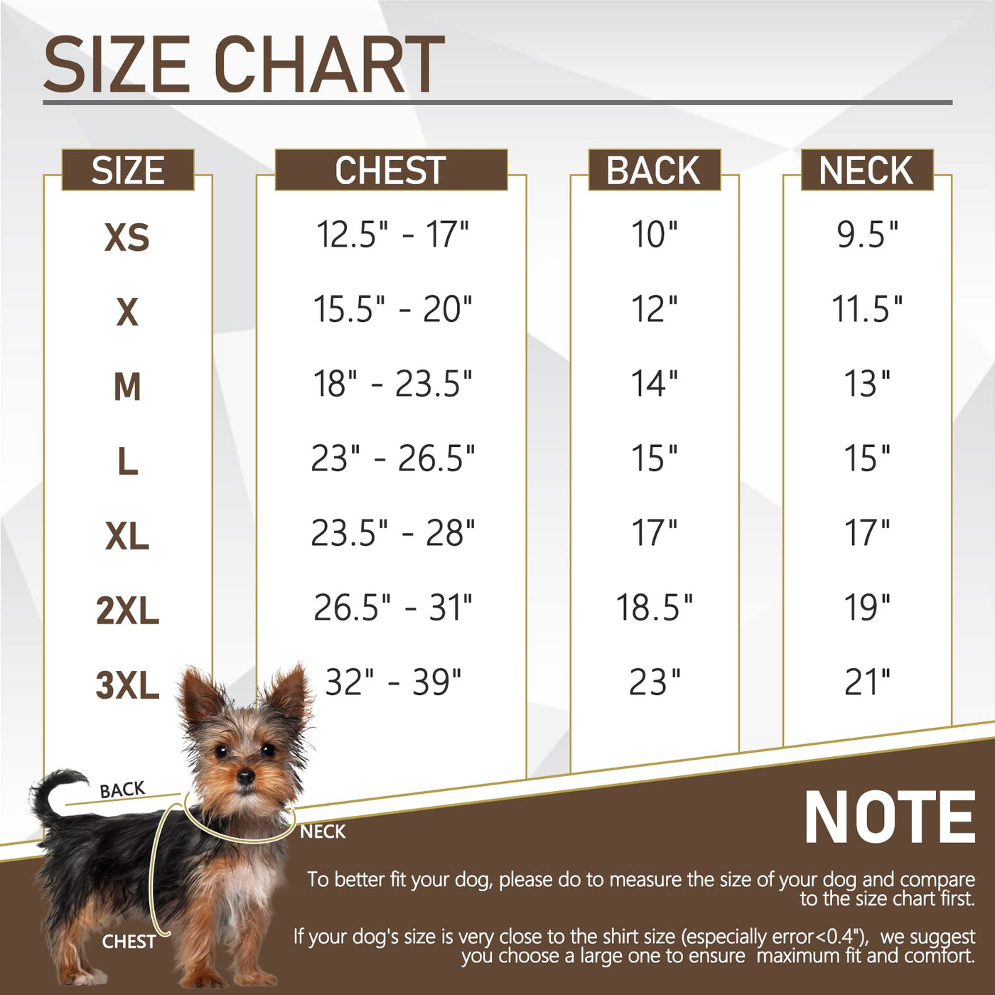 Dog Winter Coat Size From XS - XXXL: XL Chest Girth 23.5 ''-28 '' Back Length 17 '' Neck Girth 17 ''. Our winter warm dog jacket is available in 7 sizes to choose from with fleece material keeping your dog warm during chilly walks. The cozy canine winter clothing bust should be 1 '' larger than your dog 's bust. Please measure your dog 's back length and chest before purchase. Machine wash gently and air dry for convenient cleaning.