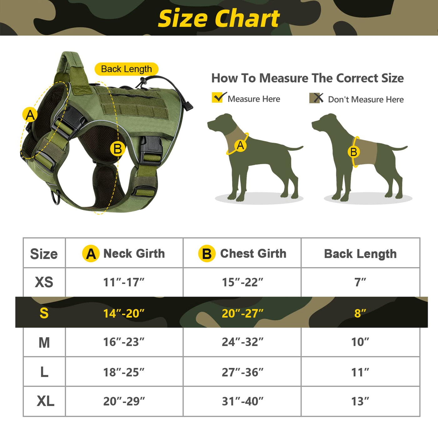 Q: What sizes does the WINGOIN Green Tactical Dog Harness come in?A: The WINGOIN Green Tactical Dog Harness is available in five sizes: XS, S, M, L, and XL. For small dogs, the recommended neck girth is 14"-20", chest girth is 20"-27", and back length is 8". Be sure to consult the size chart before purchasing to ensure the best fit for your dog.