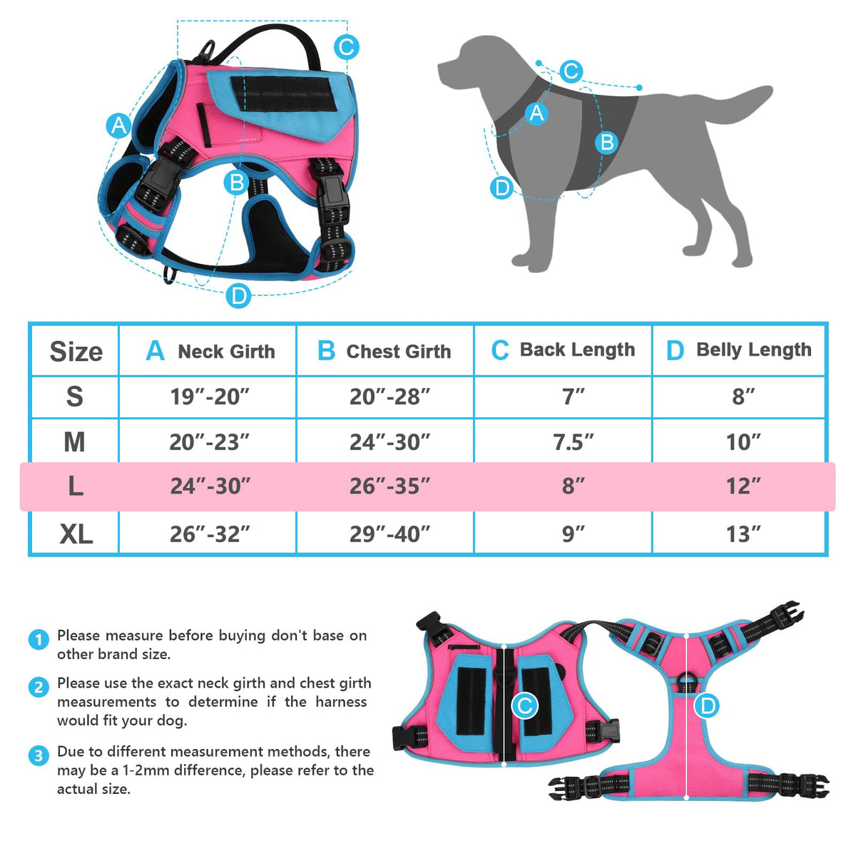 Adjustable Dog Harness: Unlike traditional harnesses large dog harness features 3 nylon snaps for easy opening and closing for quick on and off; 4 adjustable straps extend and contract to fit your dog's body perfectly with plenty of room to grow. Large (Neck: 24''-30''; Chest: 26''-36''). Please measure your dog before purchasing to choose the right size