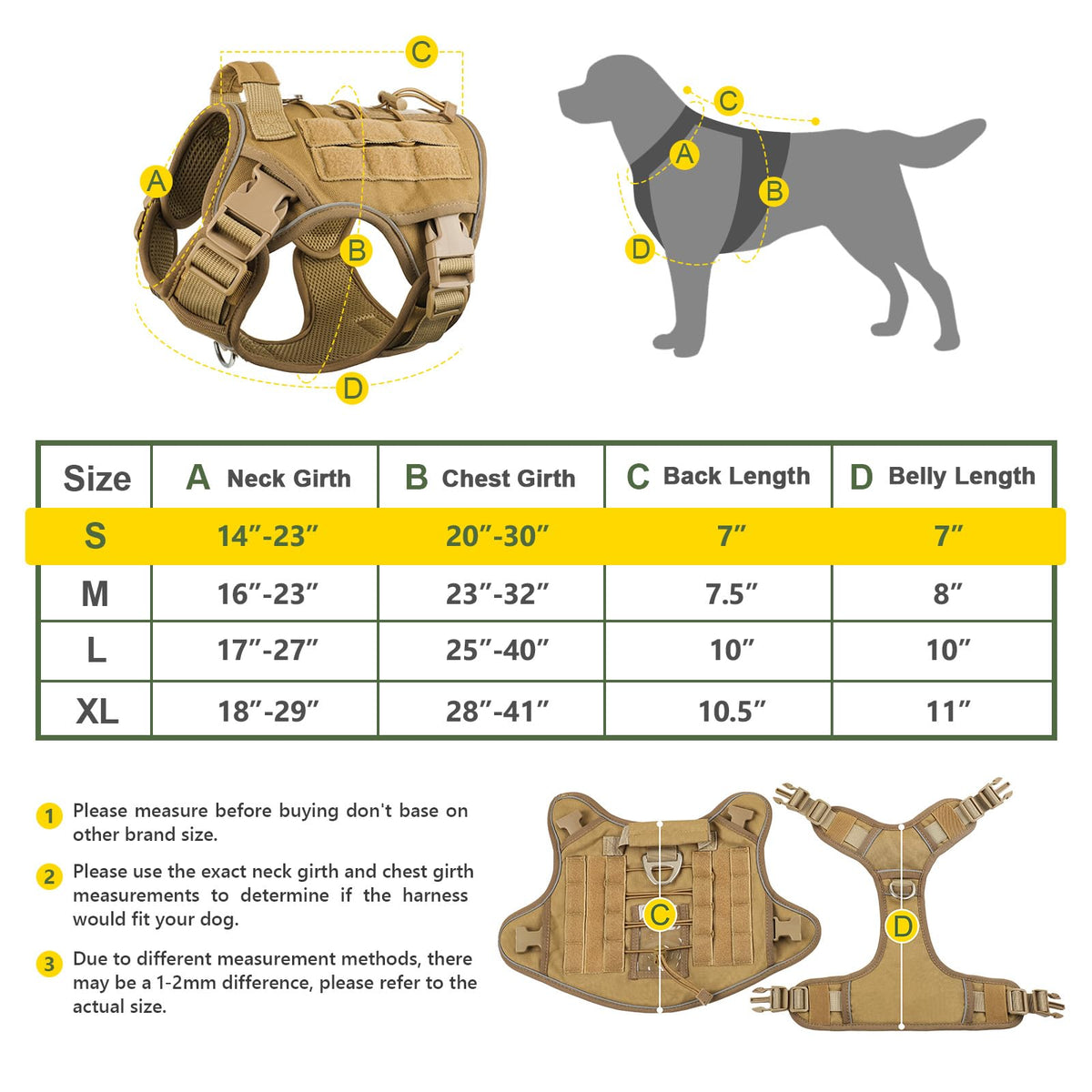 Size Instruction: Dog vest harnesses are available in S M L and XL 4 sizes for your choice. Suitable for professional K9 training hiking and walking for German Shepherds Labrador Doberman Retrievers etc. Small neck girth:14 ''-23 ''; Chest girth:20 ''-30 ''; Back length:7 ''. Please choose the right size based on the size chart