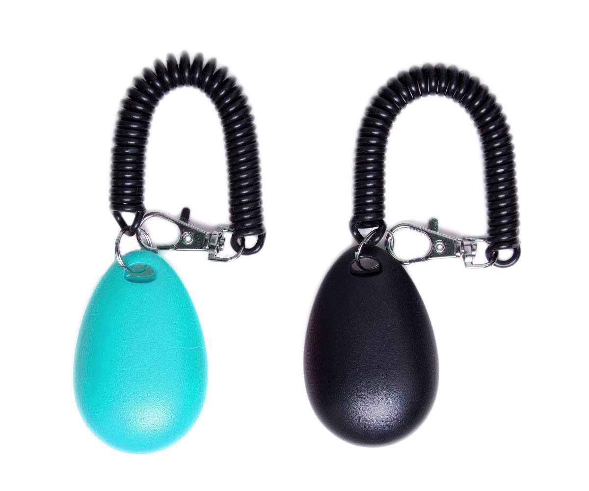 Q: What is included in the package when I purchase the training clickers?A: The package includes two training clickers, one in black and the other in cyan blue, along with wrist straps for easy handling. This makes it convenient to carry the clickers during training sessions.