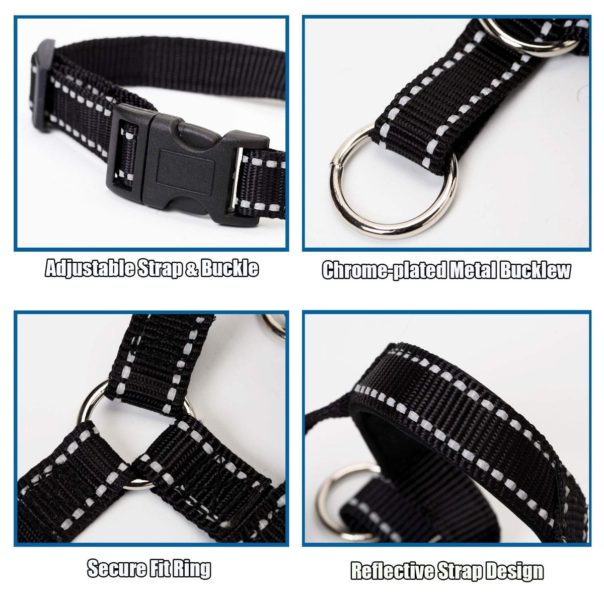 Q: How does the reflective feature enhance safety during walks?A: The Dog Head Collar is designed with 5 seams of luminous reflective threading, making both you and your dog visible during early morning or late evening walks. This feature significantly enhances safety by ensuring you can be seen by passing vehicles and other pedestrians.