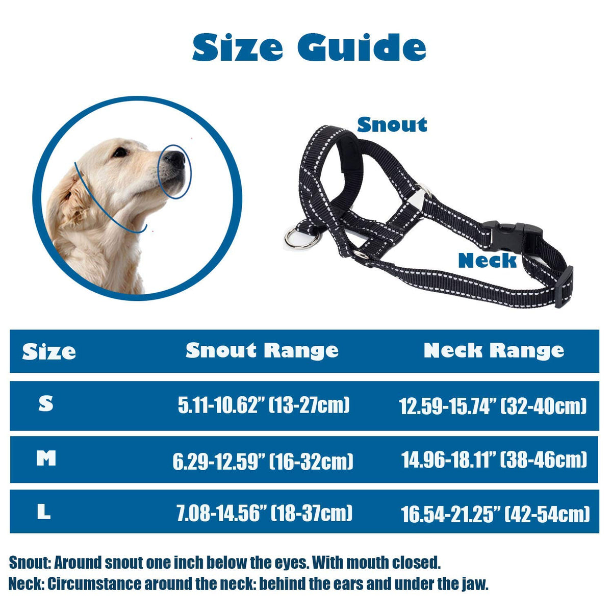 Attention: The Important Instructions About Training Dogs Accept The Dog Head Collar Step 1 Put The Collar Where The Dog Can Touch It, Let The Dog Sniff It, Continual Praise And Treat, Repeat Until Your Dog Indicates That The Collar Looks Interesting In A Way. Step 2 Take The Collar And Gently Touch It To Your Dog 'S Body, Slowly Approaching The Dog Face. Give A Treat. Repeat Until Your Dog Feels Well. Step 3 Holding The Collar In One Hand And Giving A Treat In The Other Hand, So He Needs To Put His Nose Inside The Collar To Get The Treat. Repeat This Steps Until Your Dog Seems Used To The Collar. Step 4 Put The Collar On The Dog And Quickly Lock The Buckle. Treat. Removing The Collar After Several Seconds. Step 5 Repeat Step 4 Few Times Until They Become Used To Wearing The Collar, Slowly Lengthen The Amount Of Time They Are Wearing It. Attention:Don 'T Let Your Dog Wear The Collar In A Long Time. Notes On Fasten Dog Leash Please Fasten The Dog Leash To The Strap Of Dogs Neck, Rather Than D-Ring(Mouth Loop). If You Fasten The Dog Leash To The Ring, The Collar Might Be Pulled Off When Dogs Are Running. Size Map: S - Snout Circumference: 5.11-10.62 '' ''; Neck Strap: 12.59-15.74 '' '' M - Snout Circumference: 6.29-12.59 '' ''; Neck Strap: 14.96-18.11 '' '' L - Snout Circumference: 7.08-14.56 '' ''; Neck Strap: 16.53-21.25 '' '' Xl - Snout Circumference: 8.66-16.53 '' ''; Neck Strap: 18.5-25.98 '' ''