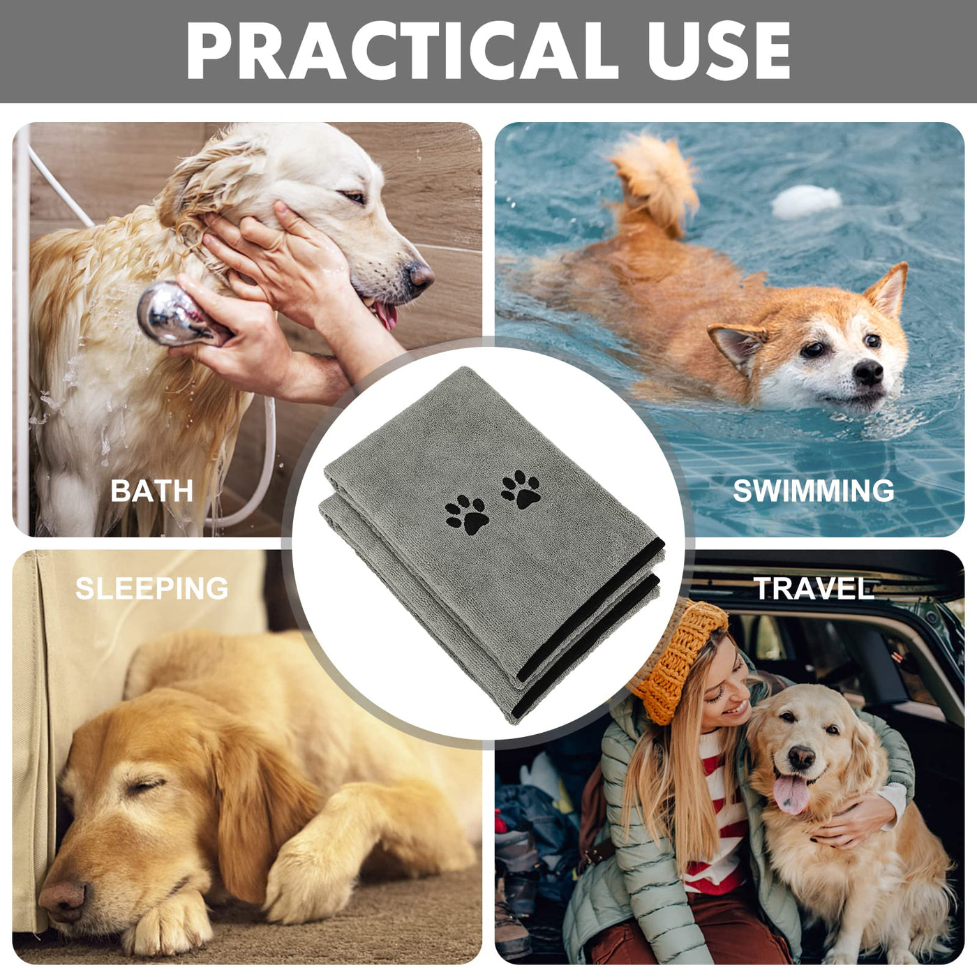 Size: 20'x35' Package quantity: 2 pack Color: Grey Features: Reuse, absorbent, and fast drying, which can quickly dry off your pet after bath. Care Instruction: You can wash and dry your microfiber pet towels in your household washer Wash below 104 Degrees Fahrenheit with mild detergent and hang dry Do Not Bleach Do not Iron Product quality problem guarantee 100% refunds