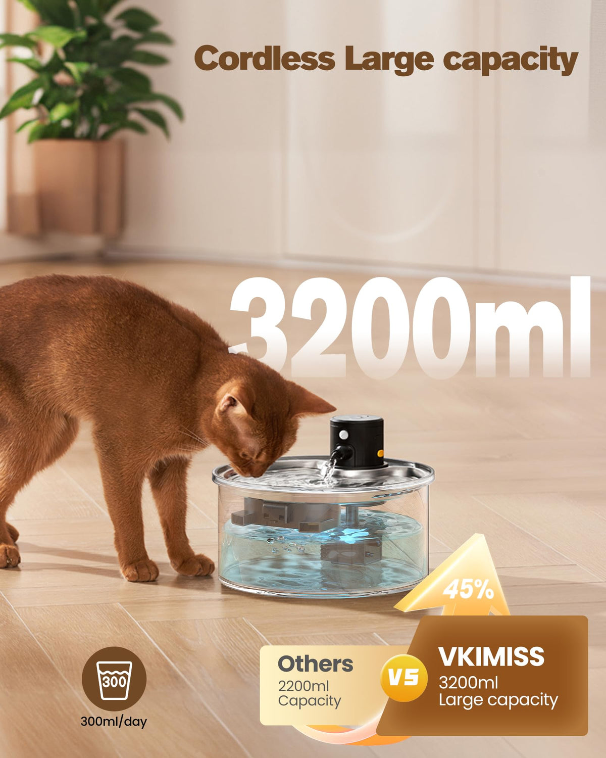 In Our Lives,Cats And Dogs Have Become An Indispensable Part Of Many Families.With The Improvement Of Pet Care Awareness,We Also Hope To Choose Faster And More Convenient Feeding Solutions Such As A Small Auto Dog Water Fountain Especially For Pet Owners Like Us Who Are Busy With Work,Often Go Out Or Travel,The Drinking And Feeding Problems Of Pets Often Become Our Concerns When We Go Out.Choosing A Kitty Spout Cat Water Fountain Can Make It Easy For Pet Owners To Provide Fresh Water For Their Pets Without Worrying About Power Problems,Which Greatly Reduces Their Burden The Animal Water Fountain Uses An Ultra-Quiet Pump,Which Is Quiet During Operation And Will Not Interfere With Pets Or Family Members.Moreover,The Kitty Water Fountain'S 108Oz/3.2L Water Tank Capacity Is Suitable For Multi-Pet Families And Reduces The Frequency Of Water Addition.Whether At Home,In The Office,Or Outdoors,The Cordless Pet Drinking Fountain Can Provide A Stable Water Source.In Special Circumstances,Such As Power Outages,The Rechargeable Cat Water Fountain Can Also Be Used As A Backup Water Source To Ensure That The Basic Drinking Water Needs Of Pets Are Met.In This Way,We Also Have More Time To Accompany Our Pets And Care About Their Growth Battery Powered Cat Water Fountain Specifications Power Source: Wireless Battery Battery Capacity: 4000Ma Maximum Power: 0.6W Sensing Distance: 1.5M Charging Voltage: 5V1A Charging Method: Usb Type-C Charging Time: 6H Standby Time: 45 Days (Timing Mode)