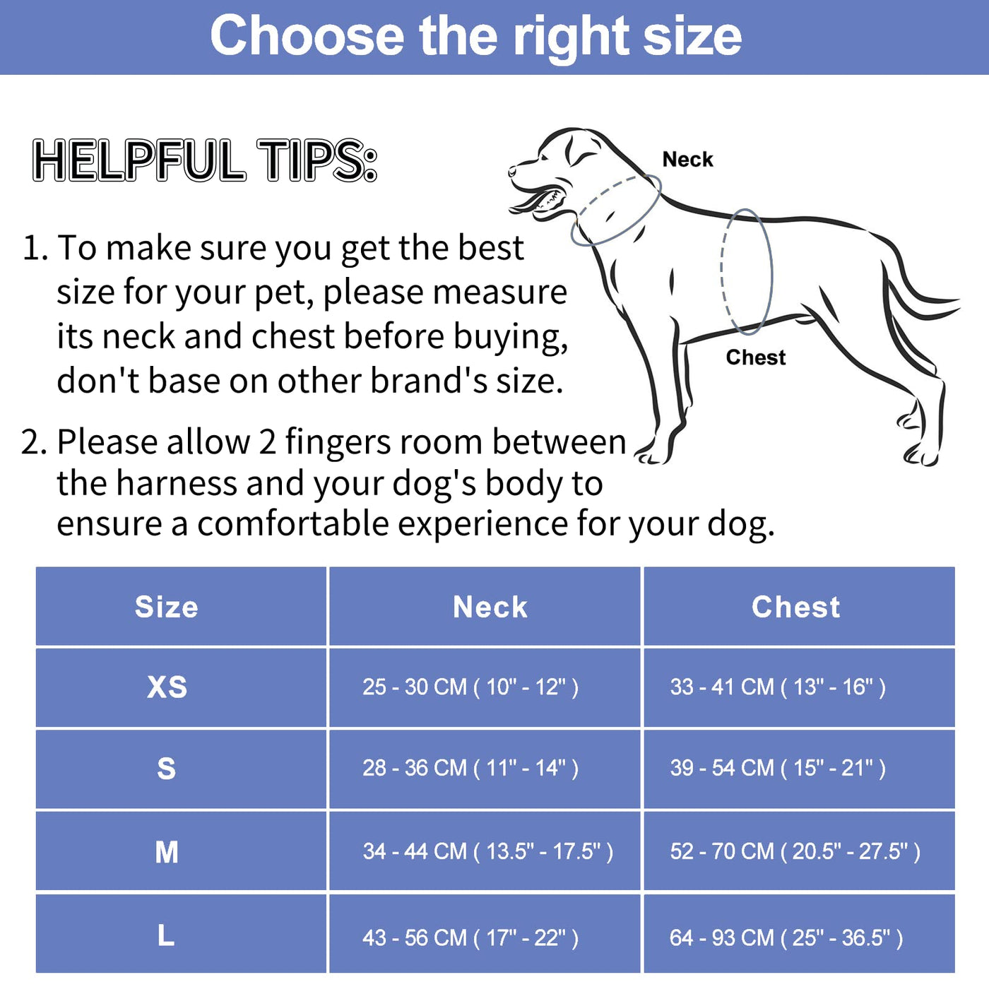 Comfortable and cushioned:The harness is made of Special scuba knitting fabric,soft and comfortable to touch, wrinkle free, good elasticity, with strong water and sweat absorption, to give your pet better experience. Adjustable premium quality nylon webbing:You can adjust the length of the webbing to fit the size of your pet. 3 Leash Attachment Points:2 on the back, and 1 on the chest,you can also hold dog ID tags and waste bags,Provides you with max flexibility and control,for your pet Outdoor Walking, Hiking and Traveling. Simple to Secure:This pet harness is easy to wear with 2 plastic quick release buckles,for the convenience of putting on or taking off. To make sure you get the best size for your pet, please measure his neck before choosing a size and then check the size chart.