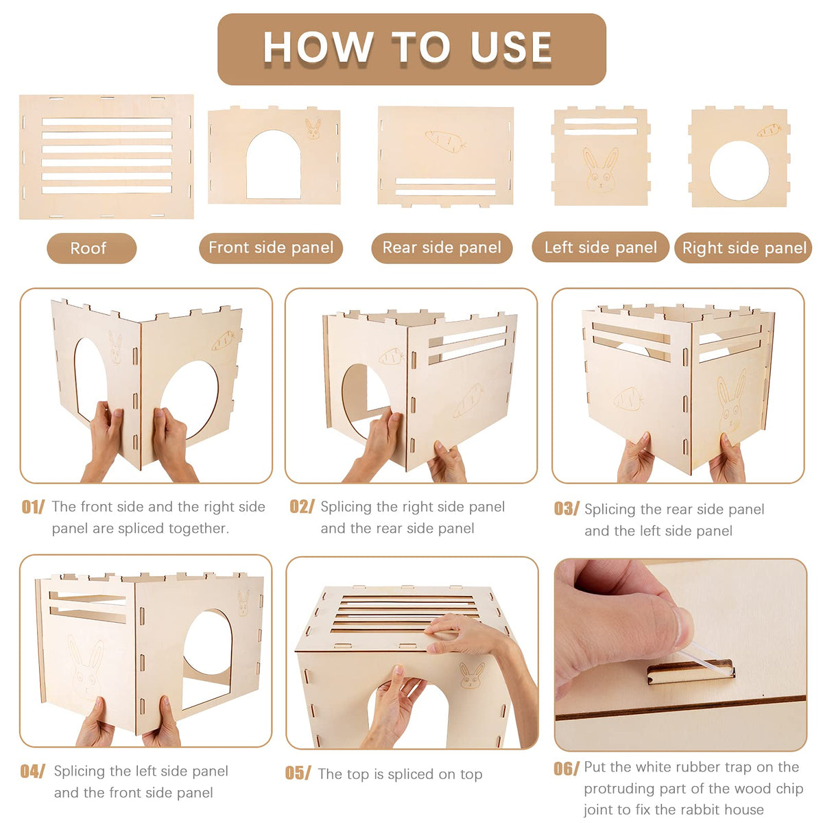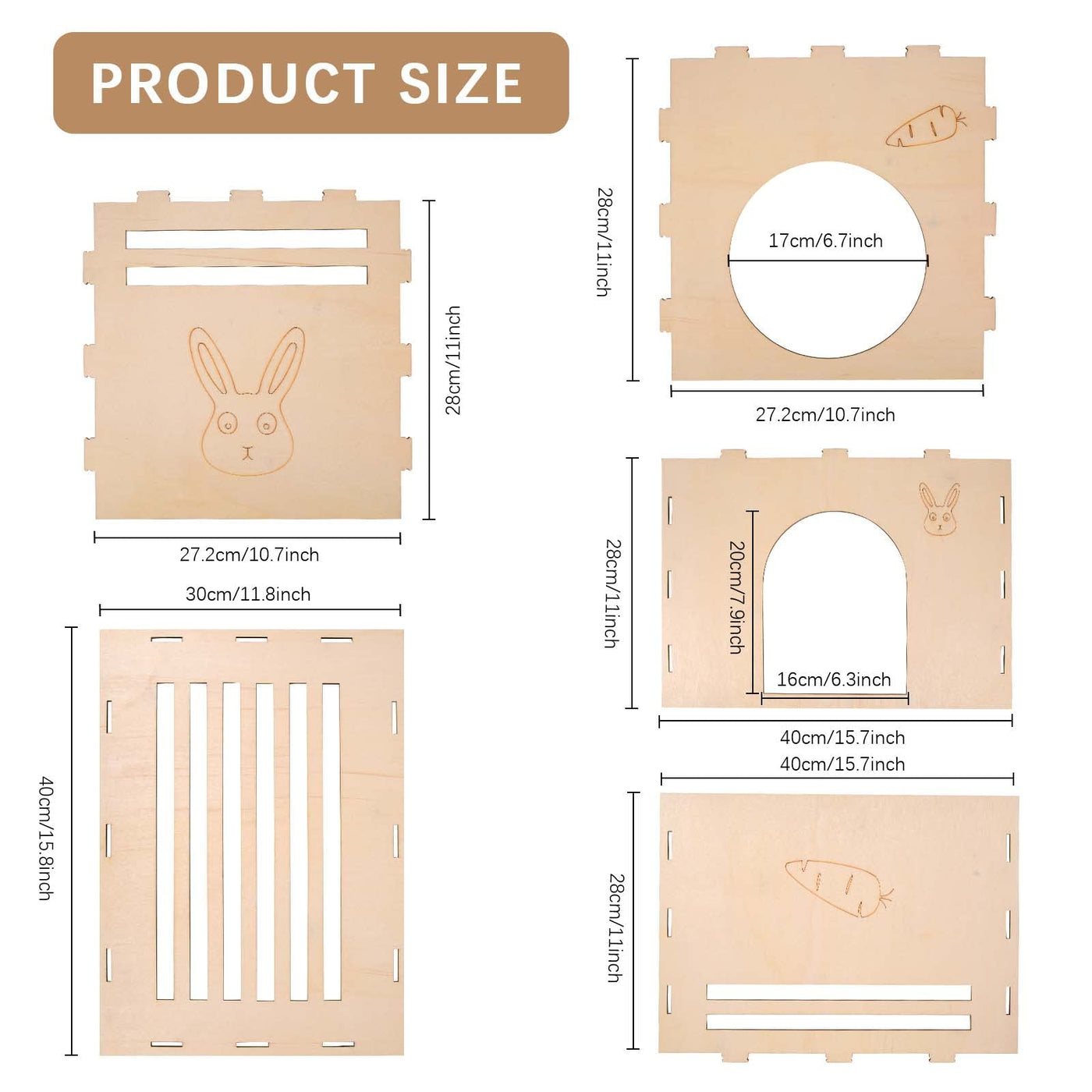 cute Rabbit Elements: There are carrot and rabbit patterns on the front side of the castle the hollow cute elements design not only add fun to the bunny but also increase the aesthetic feeling of the rabbit castle Size About: After installation the size is 158 x 11 x 11 inch 40 x 28 x 28 cm enough space for the bunny and various small animals to play hide rest and sleep in it Premium Material: Made of poplar plywood collapsible and durable Provide pets with a natural sense of security Easy to Use: The entire rabbit playhouse is designed with assembled style with rubber bands and easy to install Simple to operate and disassemble store and clean Suitable for Rabbits and More: Suitable for all kinds of small animals rabbits cats hamsters provide different feelings to your pet and add endless fun for them