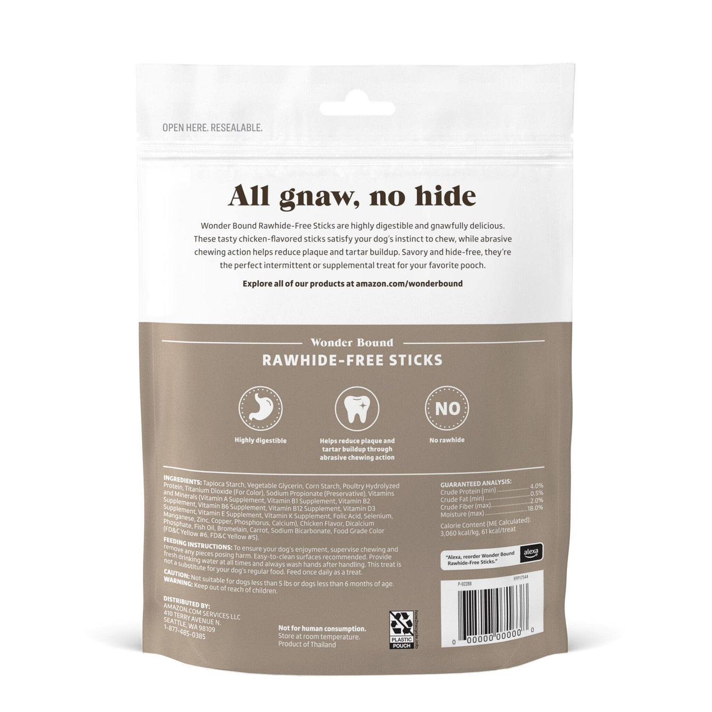Pamper your pooch with the exquisite taste of Wonder Bound Chicken Sticks, the perfect combination of flavor and function in a treat they will adore. Our chicken-flavored delights are expertly crafted to engage your dogs senses, providing a rich, savory taste that satisfies their chicken cravings in every chew. Ideal as a reward, these sticks are great for training or simply showing your pet how much you care. Steer clear of the concerns tied to rawhide with our carefully formulated treats. Suited for all dogs over 6 months old, our digestible, rawhide-free chews are the smart pick for pet parents who value safety and quality. Theyre designed to be gentle on your dogs digestive system while offering the chewing satisfaction they need. But its not just about taste-our dog treats are allies for dental health, too. Each stick is intended to assist in minimizing plaque and tartar, ensuring that your dogs teeth and gums stay clean and healthy. With every bite, the natural abrasive action works to clean their teeth, turning treat time into a beneficial dental routine. Our commitment to your dogs well-being is unwavering, which is why our treats are made without rawhide and filled with high-quality, wholesome ingredients. This means you can trust that youre giving your furry family member a treat thats not only scrumptious but also reinforces their overall wellness. Convenience is key, and our 12-count package delivers just that. Whether youre off on a walk, in the middle of training, or just want to indulge your dog, these chicken stick treats are a handy, healthy choice. Ensure your pantry is always stocked with these delectable rewards-Wonder Bound Chicken Sticks are the treat your dog will always be excited to receive.