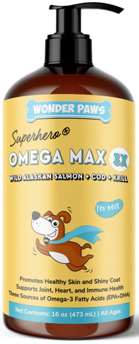 GAIN THE OMEGA SUPERPOWER! Hey, Im Waggy - a furry entrepreneur and maker of the finest supplements that can turn your dog into a powerful superhero. As soon as I tested Omega Max 3X on myself, my friends started to pay some serious attention to my shiny, supple, and luxurious coat. My hips and joints began to feel fantastic, so I could turn it up on the dance floor. So whats my secret? Its 3 different sources of Omega-3: salmon, cod liver, and krill oil - all in one supplement! It tastes great and its great for you, so drink up to your health. Our Fish Oil liquid for dogs are Made in USA in a GMP Certified Facility with global ingredients to help ensure you get the best fish oil formula for your dog. Benefits of Wonder Paws tasty natural liquid fish oil for dogs Omega Max 3X: - Supports healthy Skin and Coat - Promotes Joint and Overall Health - Maintains a Healthy Immune System - Features Omega 3 from Wild Alaskan, Cod and Krill Oil (EPA & DHA) - For Dogs of any size, age or breed. Click the Add To Cart Button above to try our Omega Max 3x today!