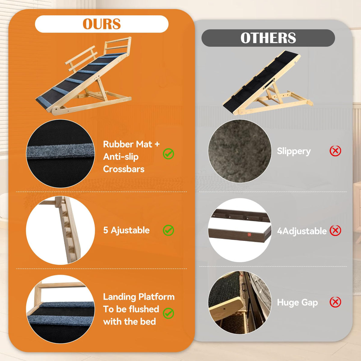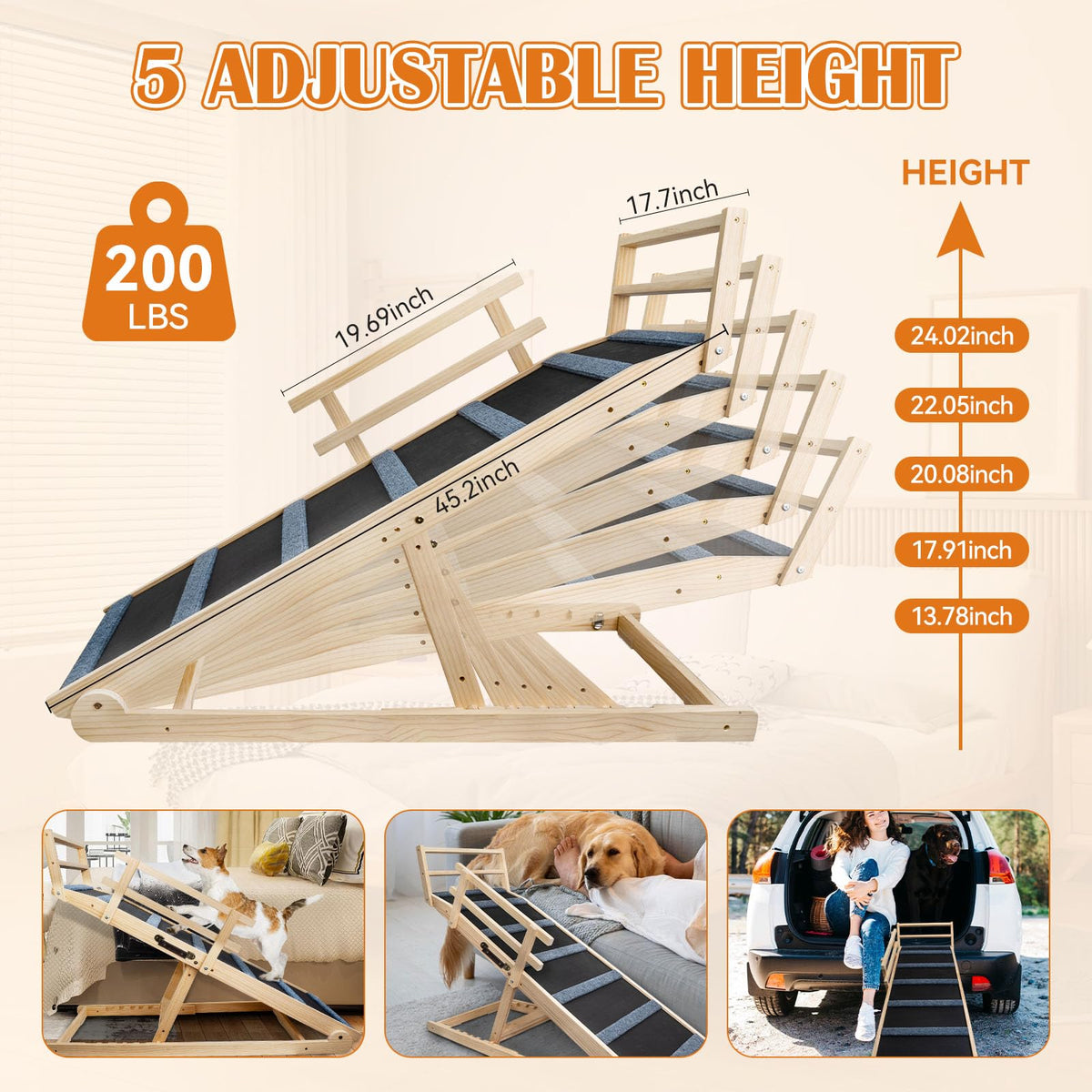 Wooden Dog Ramp For Bed - 5 Level Adjustable Wooden Ramp For Dog Extra Wide Doulbe Anti-Slip Pet Ramp With Rails