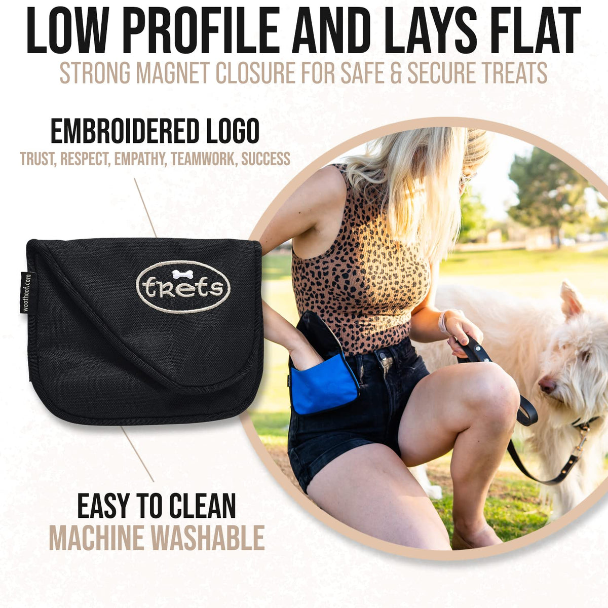 The TRETS (Trust.Respect.Empathy.Teamwork.Success) Reward Pouch is a slim, lightweight, and stylish treat pouch that allows you immediate access to treats for your dog when you need them. Features a magnetic closure for quick treat retrieval to positively reinforce our dogs behavior