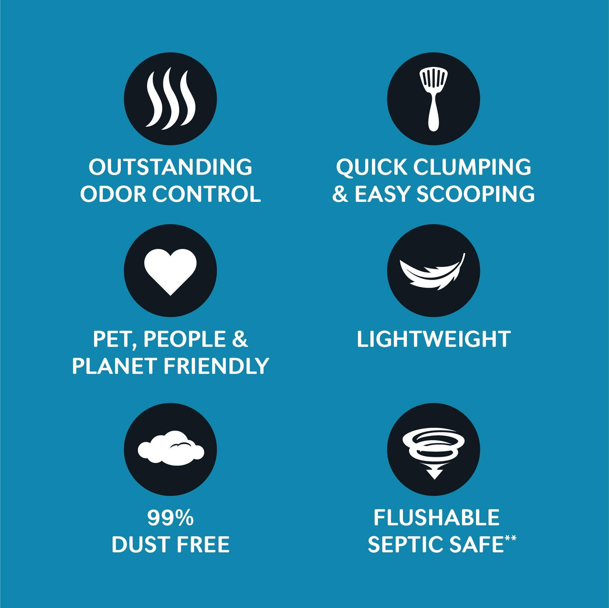 NATURALLY ScENTED - A lightweight and naturally scented cat litter made with no fake scents or artificial perfumes OUTSTANDINg ODOR cONTROL - More cats shouldnAt mean more smells - keep your cats happy with a natural litter with long-lasting odor control QUIcK cLUMPINg & EASY ScOOPINg - Multiple cats can most often mean more clean up - but not with this fast-acting natural litter that requires no chiseling or scraping LIgHTWEIgHT 99% DUST FREE & FLUSHABLE - SEPTIc SAFE - Naturally free of silica dust this lightweight cat litter offers low tracking and less mess - and is tested and proven flushable and safe for septic and sewer systems PET PEOPLE & PLANET FRIENDLY - A naturally safe litter made from whole-kernel corn that offers no harmful chemicals and no artificial perfumes Age range description: All Life Stages