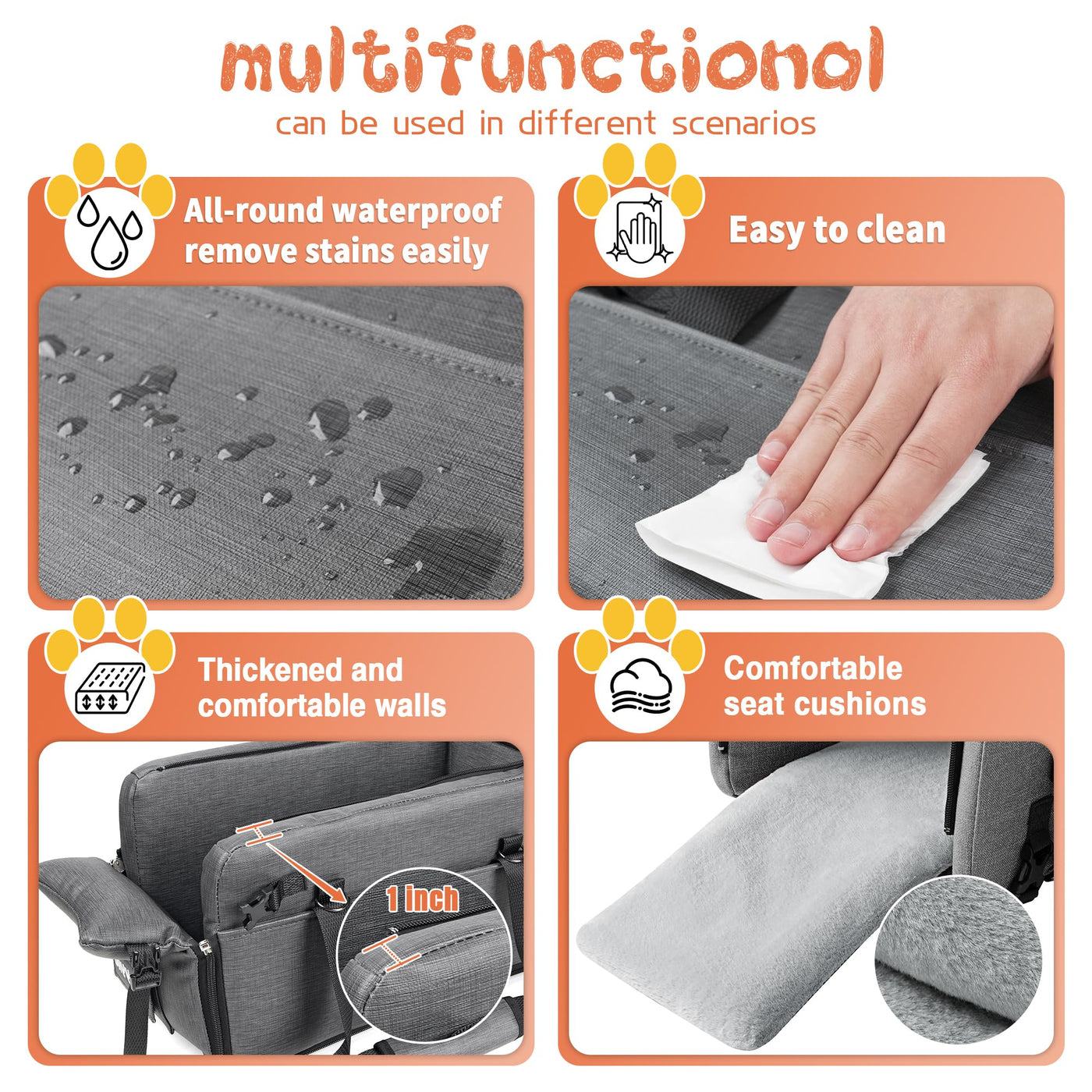 ???New and upgraded version?Removable fully waterproof easy to clean no shaking to ensure safety. The front flap on the seat can fully withstand the pressure of the pet. Top ventilation provides better airflow and cooler for your pet and can be unfolded or stowed away.