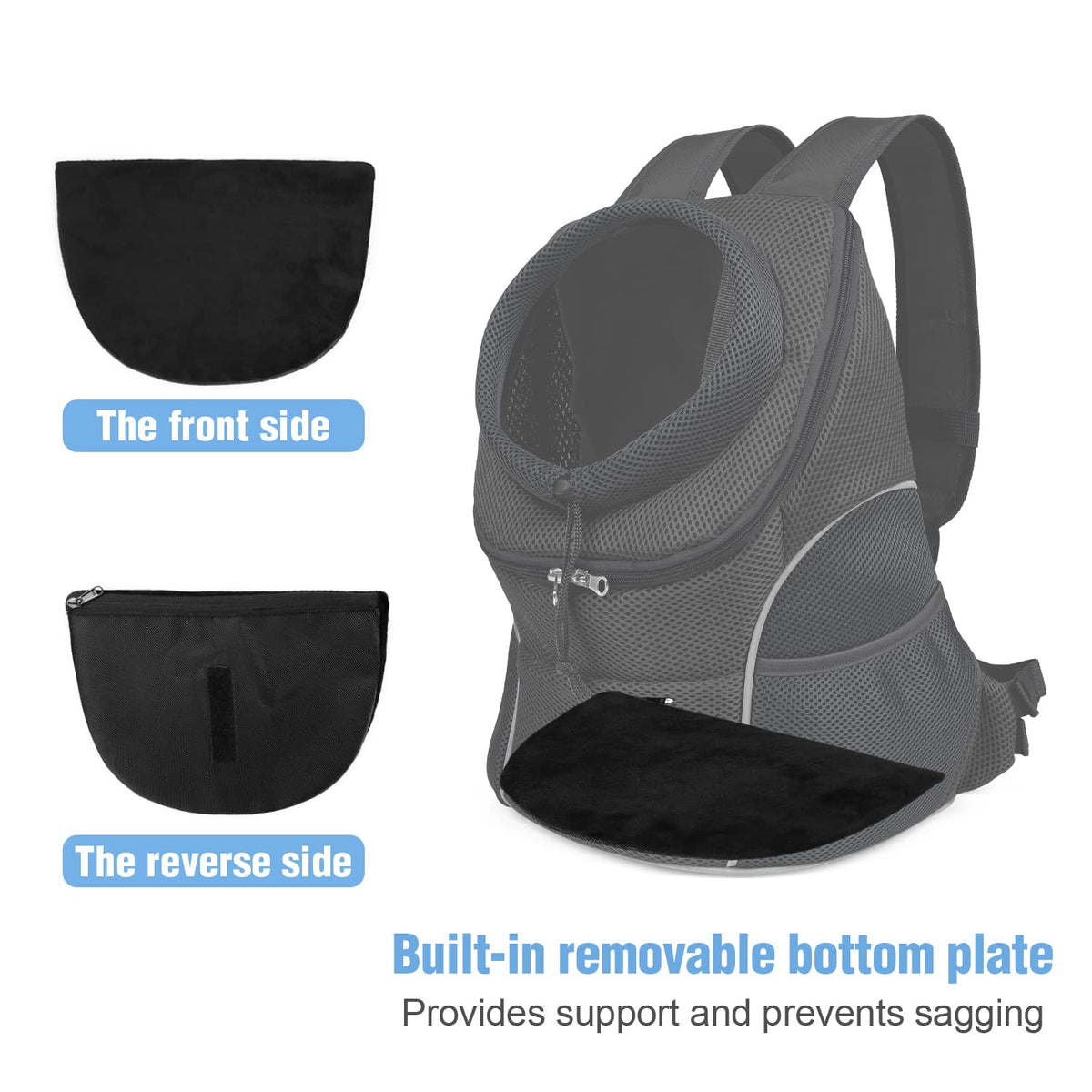 Thick sponge filled & Removable bottom plate: The dog front carrier backpack which is ergonomic and very comfortable reducing the burden on the shoulders and back of the owner. Soft and removable washable pads and removable solid bottom covers add comfort prevent sagging maintain stability and are easier to replace/clean
