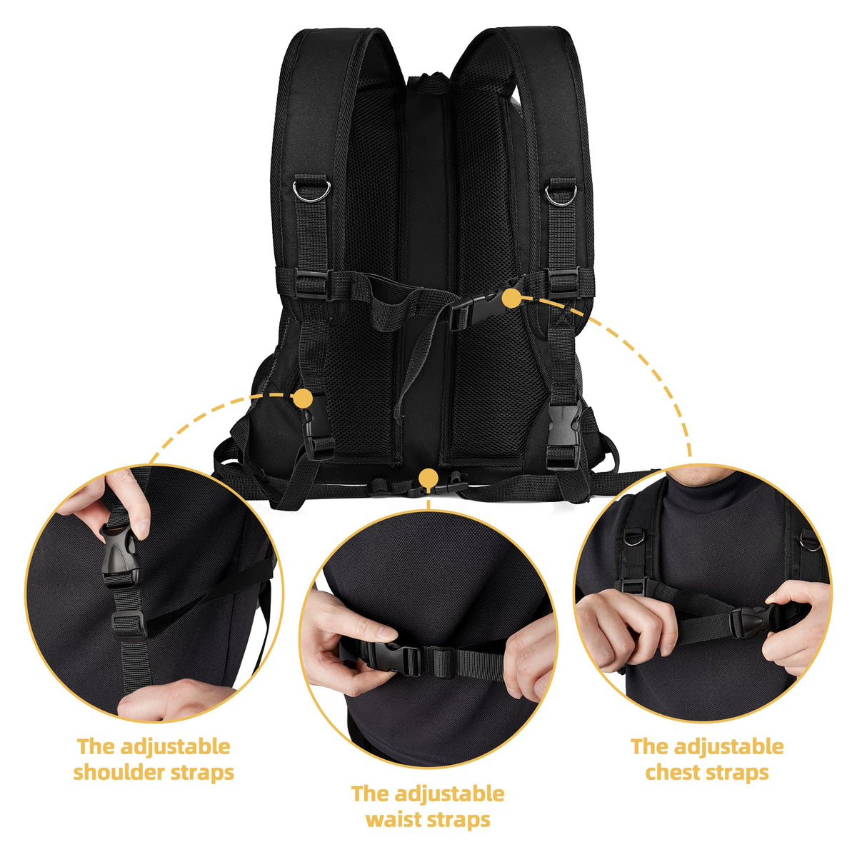Q: Is the backpack adjustable for different body types?A: Yes, the backpack features adjustable shoulder straps ranging from 23.6 to 39.4 inches, as well as an adjustable chest strap up to 13.8 inches and a waist strap that can be adjusted up to 33.9 inches, making it suitable for most users.