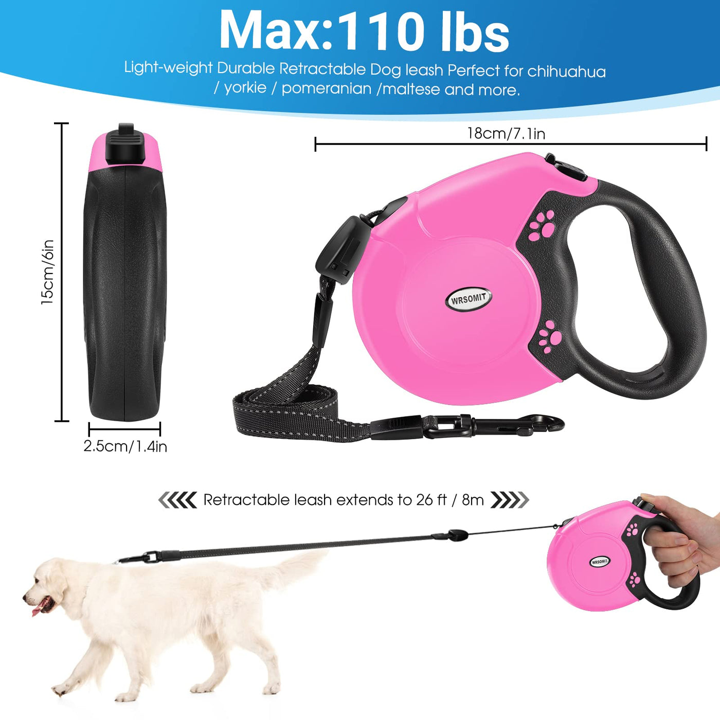 Features: It Provides An Excellent Choice For A Leash For Large Dogs Or A Leash For Medium-Sized Dogs. Suitable For Small, Medium And Large Dogs Or Pets Up To 110 Lbs. Nylon Tape Extends Up To 26 Feet And Has Been Tested With Multiple Pull Times For Extra Strength And Durability, Please Do Not Let Your Pet Tear It . Advanced Abs Shell Structure, Long-Lasting. Safe And Long-Lasting Rust-Proof Swivel Hook, Made Of Zinc Alloy. Ergonomically Designed Handle, Comfortable Grip, Able To Easily Grasp, Suitable For Most Adults' Hands, Making Control Easier. One-Touch Brake And Locking Mechanism With Pause Function, Lean Forward And Press The Big Button To Lock The Length, Then Dial Back The Small Button To Unlock, More Secure And Convenient.