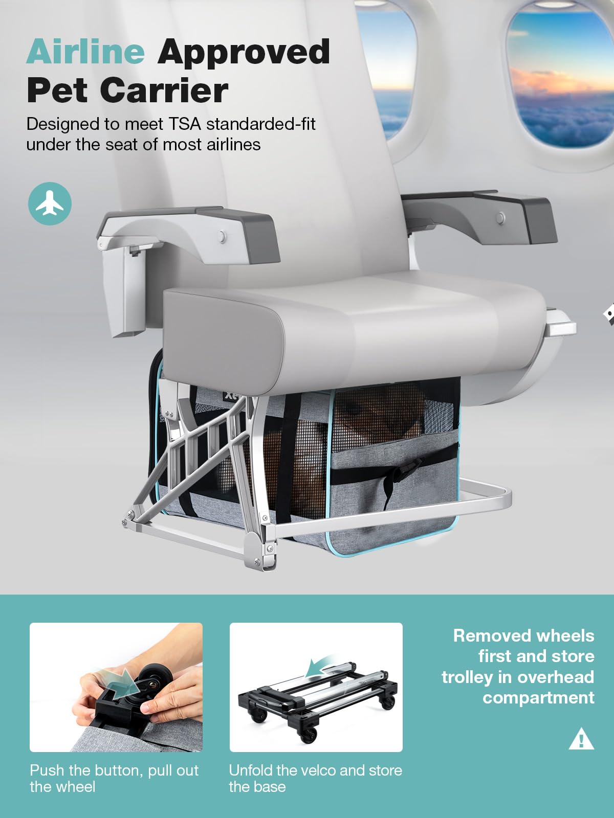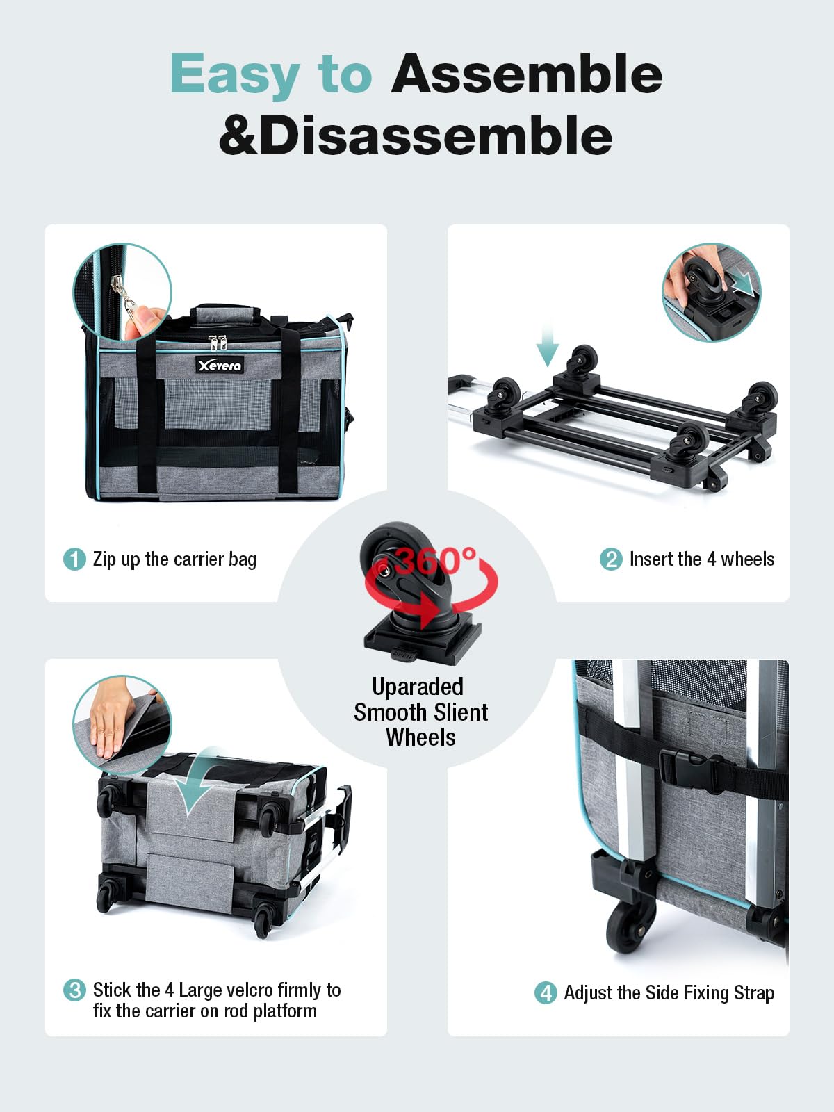 Xevera Pet Carrier With Wheels For Small Dogs And Cats Product Specifications: Pet Carrier Bag Size (Without Wheels): 16.93''L X 11.02''W X 11.02''H Wheel Height: 3.2 Airline Approved: Fit The Under Seat Of Most Airline. Note: Getting In Touch With The Airline To Find Out What Their Policies Are Is Very Important, Because Each Airline Has Its Own Rules. Package Included: 1 X Foldable Pet Carrier Bag 1 X Removable Platform With 4 Detachable Wheels And Telescopic Handle 1 X Padded Adjustable Shoulder Strap 1 X Comfortable Pet Mat 1 X Pet Bowl Features: Sturdy & Durable Design- Wire Frame In Both Sides Support The Carrier To Be More Sturdy And Prevent The Sides From Caving In Like Other Soft-Sided Carriers. Good Air Circulation- Mesh Front And Back Allows Air To Circulate More Freely, Keeping Your Pet From Overheating And Providing A Fresh Supply Of Oxygen. Convenient Storage Pockets: The Side Pockets Can Store Pet Treats And Toys. High Quality Telescopic Handle: The Telescopic Handle Can Be Pulled At Any Angle, 4 Wheels Swivel Easily And Are 360 Degree Rotatable. Safety: Includes An Inner Safety Strap And Self Locking Zippers To Prevent Your Pet From Escaping. 2 Entrances: The Top And Front Openings Are Easy For Pet To Get In And Out Of The Pet Carrier. Suitable For Plane Travel, Road Trips, Going To The Vet, Or Camping. Kindly Note: Perfect Pet Carrier For Small And Medium Pets Under 15 Lbs. Always Check With The Airlines For Their Latest Pet Guidelines Before Departure.