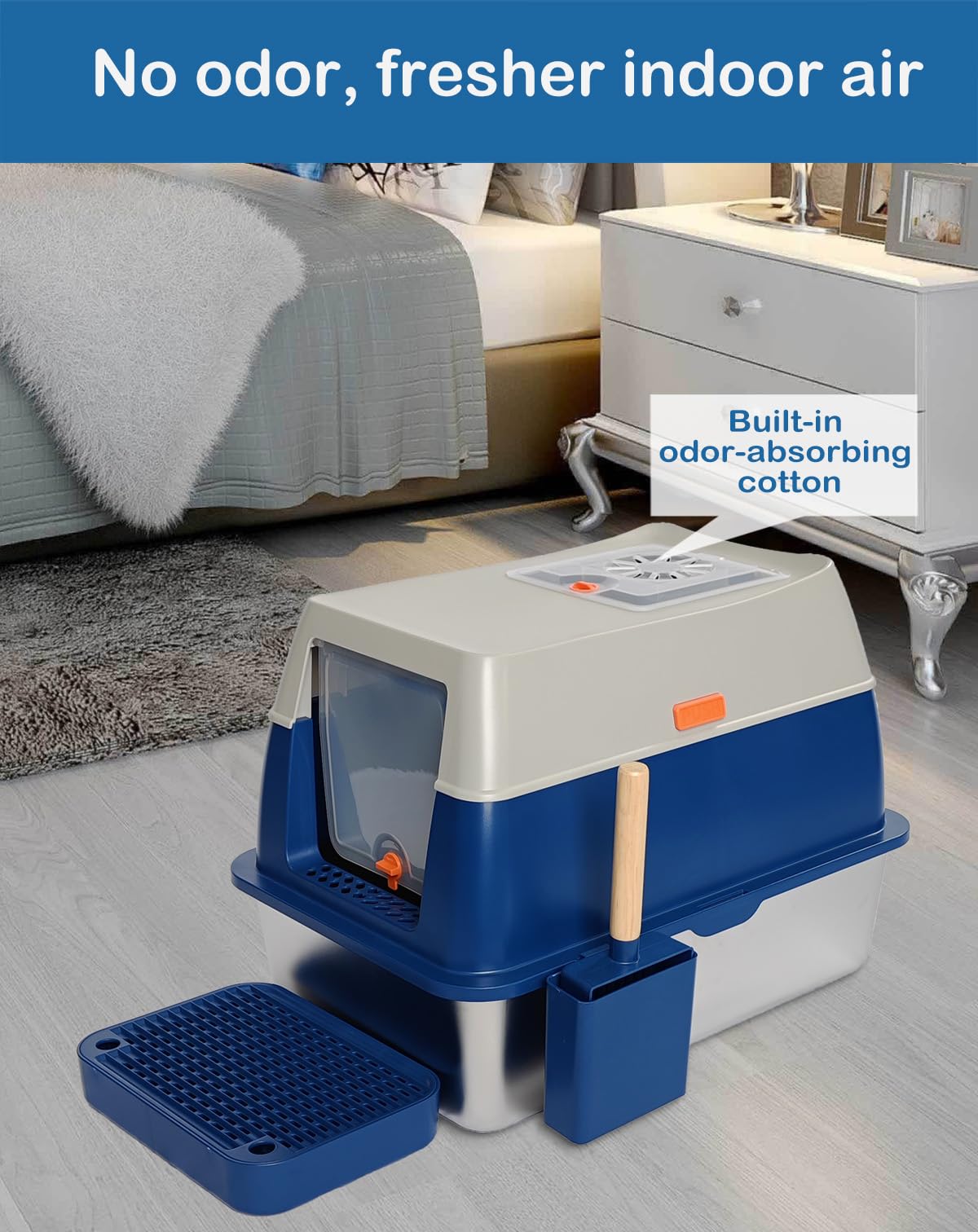 1. Our Enclosed Stainless Steel Cat Litter Box With Lid Is Spacious, Length, Width And Height Are 24 In 16 In 16 In, Suitable For Families With Large Cats And Multiple Cats; 2. This Enclosed Cat Litter Box Has Two Entrances And Exits, The Front Door And The Top, Providing More Choices And Fun For Active Cats; 3. The Top Entrance Of The Cat Litter Box Is Equipped With A Cover With A Replaceable Air Filter, Which Can Absorb Odors In The Cat Litter Box And Prevent It From Spreading To The Outside And Affecting The Air Quality Of The Room; 4. The Front Door Of The Cat Litter Box Can Be Used In 4 Ways: (1) Can Be In And Out, (2) Only In, (3) Only Out, And (4) Completely Closed. Through The Position Control Of The Knob-Type Door Bolt, Except For The First One, The Latter Three Types Need To Be Used Under The Premise Of Opening The Top Entrance; 5. The Upper Cover Of The Cat Litter Box Can Be Easily Removed By Pressing Two Buttons, Which Is Convenient For Removing Cat Feces; 6. This Closed Cat Litter Box Can Also Be Used As A Semi-Open High-Walled Cat Litter Box By Removing The Upper Cover; 7. The Pedal Can Reduce The Height Difference Between The Front Entrance And The Ground, Providing Convenience For Cats With Limited Mobility To Enter And Exit The Cat Litter Box. The Surface Grille Design Can Also Recycle Cat Litter And Reduce Cat Litter Diffusion; 8. The Included Cat Litter Shovel Can Be Hung On The Side Of The Cat Litter Box Through A Shelf For Easy Access At Any Time; 9. The Stainless Steel Basin Is Sturdy And Durable, Not Easily Scratched By Cat Claws And Cat Litter Shovels, Easy To Clean, And Does Not Produce Odor; 10. The Stylish Shape And Versatile Gray Can Perfectly Integrate Into Various Styles Of Home Environments.