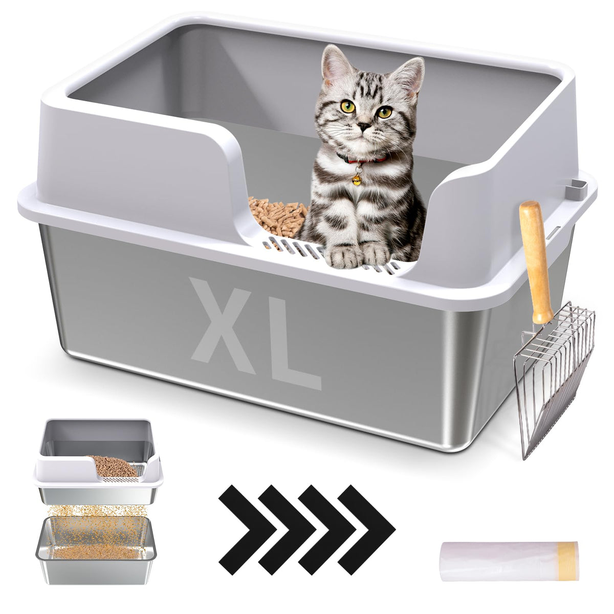 ?Extra Large Size And High Lid Design Provides Your Pets With Freedom And More Privacy For Toileting? Our Litter Boxes Are Designed With A High Lid To Prevent Litter From Scattering On The Floor And To Prevent Urine Leaks, Thus Keeping Your Home Clean And Reducing Litter Waste. ?Sifting Litter Box Simplifies Your Cleaning Process? The Stainless Steel Sifting Litter Box Quickly Separates Waste From Clean Litter, Keeping The Cat Litter Box Clean, And The Bottom Box Holds 2 Inches Of Thick Sawdust, Creating The Perfect Space For Waste Storage. When The Bottom Box Is Full Of Waste, You Can Simply Lift The Sifting Pan And Shake It From Side To Side To Easily Dispose Of The Waste Without The Need To Scoop, Making Litter Cleanup Simple And Easy. ?Great Affordable Sifting Cat Litter Box For Multi-Cat Households? This Stainless Steel Litter Box Is Made Of Stainless Steel, Compared To Plastic Litter Boxes, It Does Not Absorb Odors, And Also Scratch Resistant, Can Be Used For A Long Time Without Frequent Replacement. This Is An Affordable Litter Box For Multi-Cat Households.Good Money-Saving Helper! ?Stainless Steel Cat Litter Box,Double Order Control? When Your Pet Pees, The Pine Pellet Sand Absorbs The Liquid And Turns Into Sawdust That Falls Into The Bottom Box. The Odor Is Buried Between The Sieve Basin And The Bottom Box And Will Not Emit. At The Same Time, The Stainless Steel Material Will Not Absorb Odors, Providing A Double Guarantee For Odor Control. ?Perfect 2 Inch Space For Waste Storage, No Need For Daily Waste Disposal? A 2-Inch Space Is Reserved Between The Bottom Box And Sifting Litter Box For Easy Waste Storage. You Don'T Need To Dispose Of Waste Every Day, Helping You Save More Time And Energy Every Day, Which You Can Use To Spend With Your Lovely Pets!
