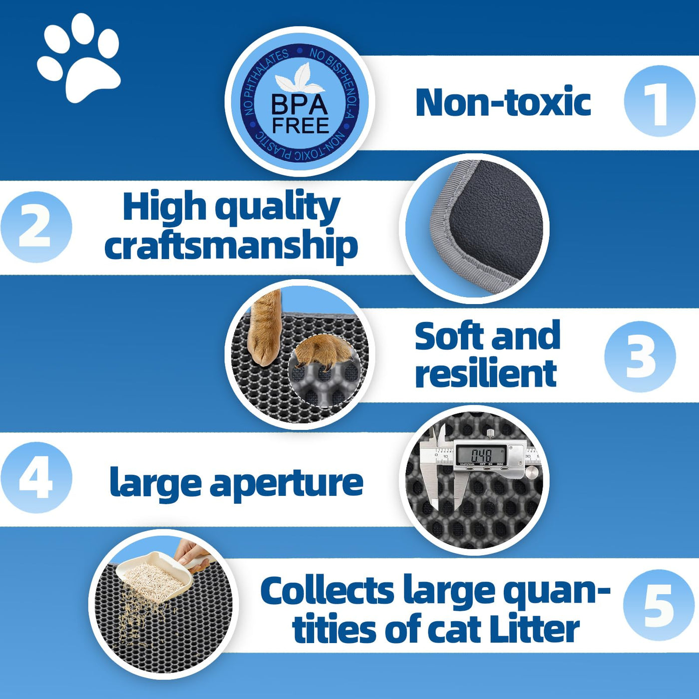 Are You Tired Of Constantly Cleaning Up Scattered Cat Litter? Say Goodbye To Messy Floors With The Xuanyaente Cat Litter Mat. Our Innovative Honeycomb Double-Layer Design Effectively Traps And Contains Litter, Preventing It From Spreading Throughout Your Home. No More Annoying Litter Stuck To Your Feet! The Mats Bottom Layer Is Made Of Premium Leather, Which Is Waterproof And Urine-Proof, Providing Ultimate Protection For Hardwood Floors And Carpets. The Leather Base Minimizes Creases, So You Wont Be Frustrated By Stubborn Folds When You Receive Your Mat. Cleaning Is A Breeze! Simply Pick Up The Mat And Let The Litter Fall Back Into The Box Through The Holes For Easy Recycling. This Is Much More Convenient Than Traditional Mats. Additionally, The Mat Is Washable And Can Be Deeply Cleaned With A Vacuum Cleaner Or Water. We Care About The Safety And Comfort Of Your Pet. Our High-Quality Litter Mat Is Made From Bpa-Free, Pet-Friendly Materials That Are Gentle On Sensitive Paws. Plus, The Bottom Layer Is Non-Slip, So It Stays In Place Once Set Up. Invest In The Xuanyaente Litter Mat To Keep Your Home Clean And Tidy, Free From The Hassle Of Scattered Litter. Our Product Comes With A One-Year Warranty And 24-Hour Customer Service. Order Now To Experience The Difference!