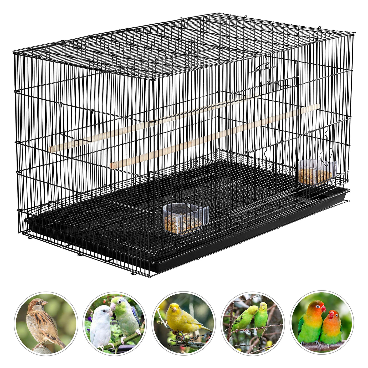 Spacious Flight Cage: This generously-sized birdcage measures 30.5 L x 18.5 W x 18 H, which allows 3-4 small/medium pet birds to stretch wings and hop around cheerfully at the same time. Besides that, the roomy cage also has ample space for nests, perches, and swings | 2 Wood Perches and 2 Feeders Included: For ease of use, this parrot flight cage comes with two plastic feeders and two wooden dowels. Your feathered friends can enjoy their new home immediately right after a simple assembly | Multiple Doors For Various Purposes: The front drop-down door has an embedded smaller door, so you can have a large opening when cleaning or decorating the interior and a little entrance specially for birds. The feeder doors allow for a convenient feed refilling from the outside | Slide-out Tray and Bottom Grate: The slide-out tray makes daily cleaning and maintenance less troublesome. And the grate above the tray prevents birds from walking directly on their droppings | Stackable For More Convenience: Benefitting from the light weight and robust construction, you can stack two flight cages together for more birds to save space and easily manage multiple cages