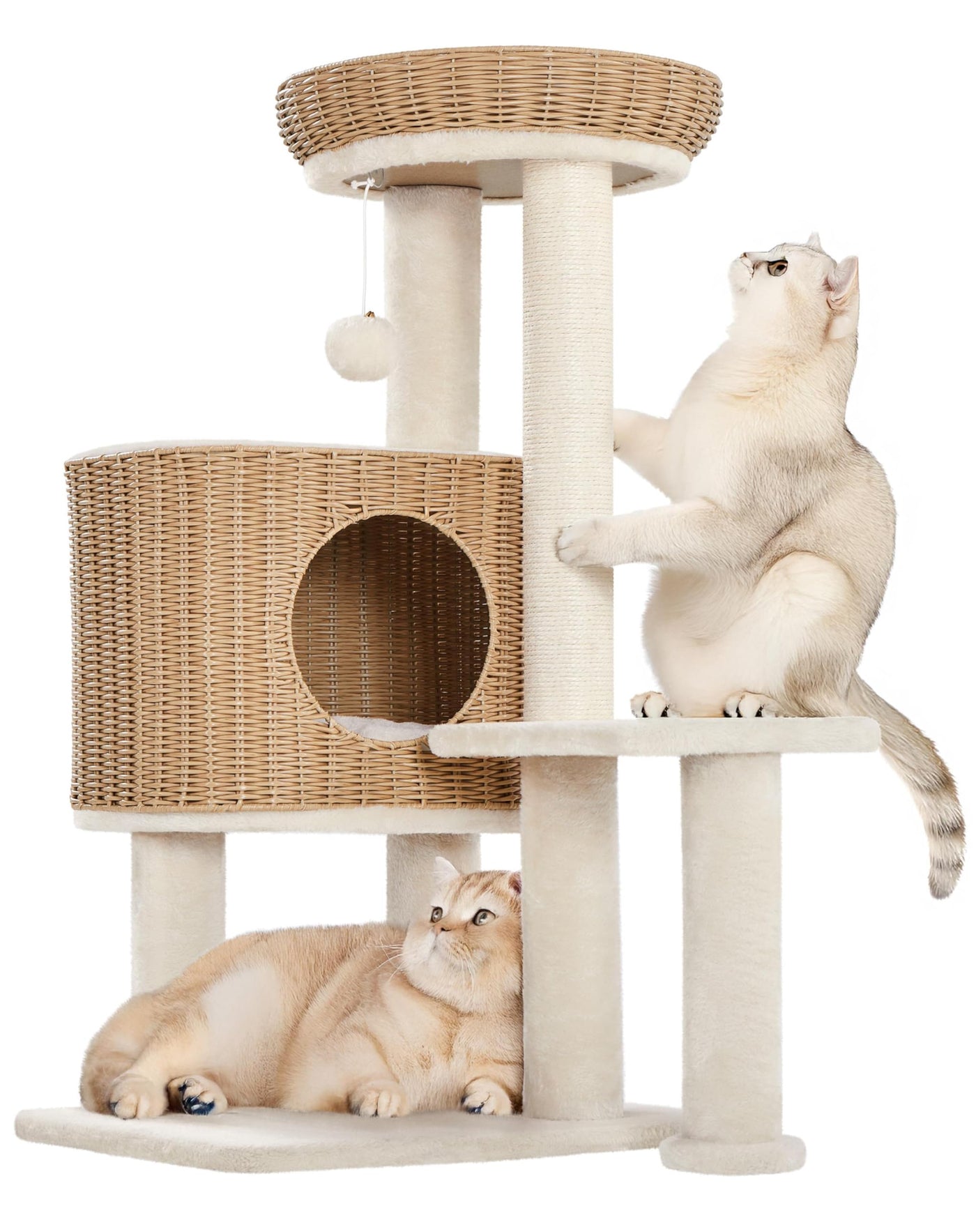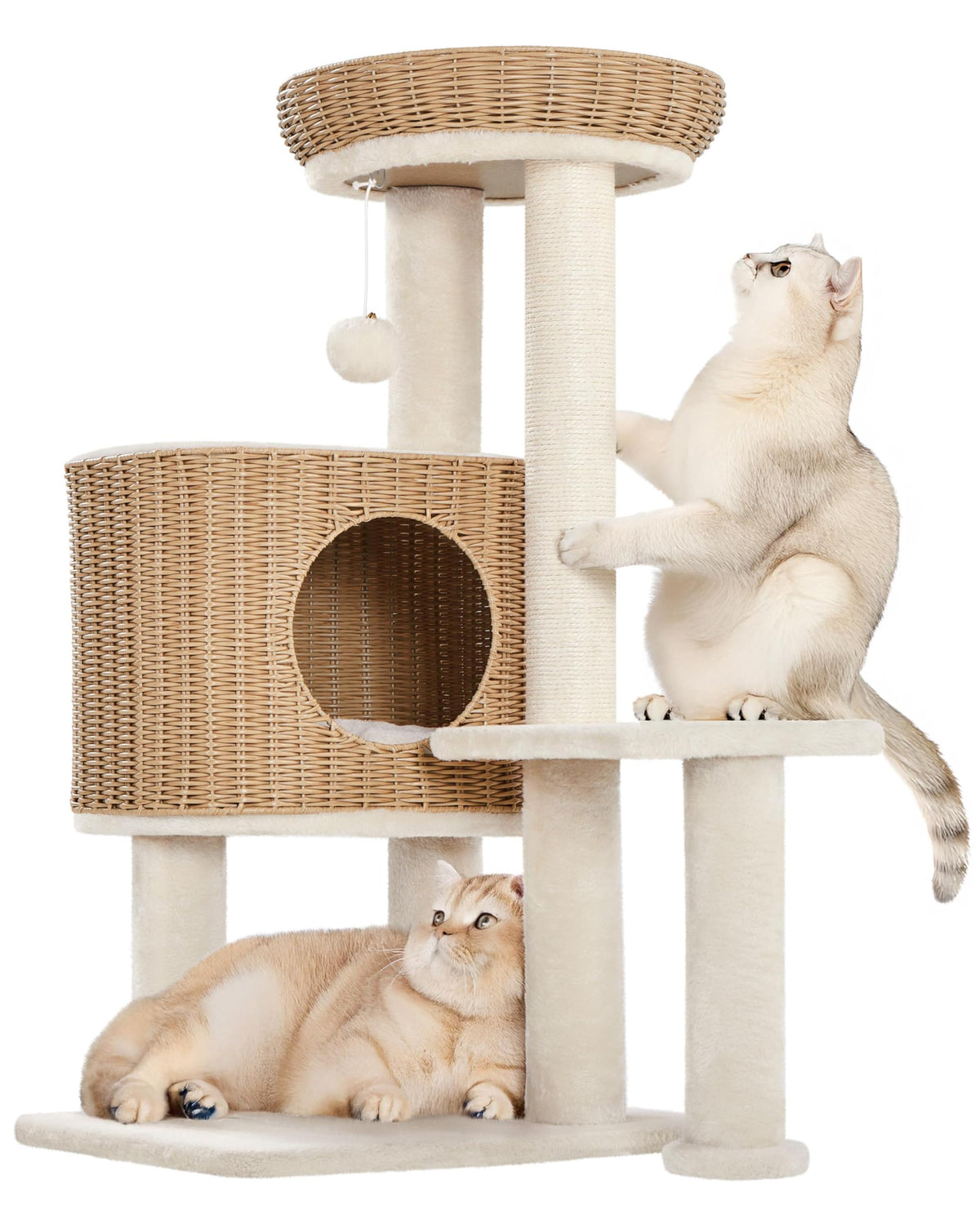SUMMER COOL RECOMMENDATION: Our aesthetic cat tree combines modern design with rattan cat tree functionality. The hollow rattan structure promotes air circulation, ensuring breathability and a cool spot for your cat during hot weather. Perfect for small cat tree spaces or boho cat tree enthusiasts seeking style and comfort! | DETACHABLE & WASHABLE FLEECE: Soft fleece layers in the rattan cat trees top perch and condo create cozy, private retreats. Ideal for napping or lounging, this feature elevates our cat tree bed into a versatile sanctuary for your pet. | EXTRA LONG SCRATCHING POST: The 19-inch natural sisal post on this modern cat tree lets cats satisfy scratching instincts while protecting furniture. A must-have for small cat tree setups! | EXTRA LARGE PLATFORM: The spacious platform on our modern cat tree offers a soft, elevated vantage point for cats to relax together while observing their surroundings. Great for multi-cat homes or cat tree bed lovers! | DETACHABLE DANGLING BALL: Spark playtime energy with the removable toy ball! This aesthetic cat tree feature taps into hunting instincts, encouraging leaps and runs. A playful addition to boho cat tree or ratten cat tree designs.