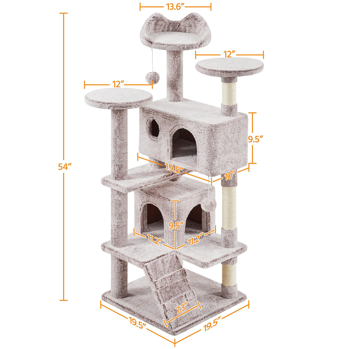 Q: What are the dimensions of the Yaheetech 54in Cat Tree?A: The overall dimensions of the Yaheetech 54in Cat Tree are 19.5 inches L × 19.5 inches W × 54 inches H. The big condo measures 19.5 inches L × 10 inches W × 9.5 inches H, while the small condo measures 11.2 inches L × 11.2 inches W × 9.5 inches H.