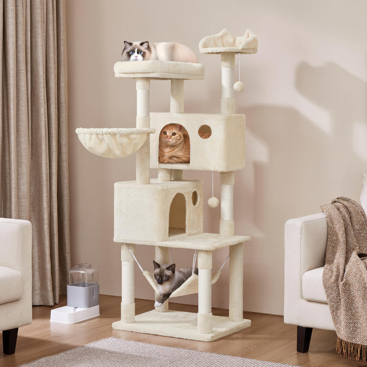 Multilevel Cat Tree Large Cat Tower with Condos Platform Perch Hammock Scratching Posts Plush Cat House Cat Tree for Small Medium Cats Quick overview:Looking for a comfortable cradle for your feline friends? This multifunctional cat tree is just what your cats need! Designed with love and care, it features two cozy condos, two platforms for perching, multiple sisal-covered scratching posts, and two fluffy balls for endless fun. Made from sturdy particleboard, soft plush, and durable sisal, it s built to last through every nap and scratch. Plus, it keeps your cats entertained even when youre away-no need for extra toys or supplies! Worried about setup? No stress-our clear instructions make assembly a breeze.Specifications: Color: BeigeMaterials: Particleboard, Plush, Sisal Rope Assembled Dimensions: 60 cm L 48 cm W 163 cm H / 24 L 19 W 64.5 H Baseboard: 60 cm L 48 cm W / 24 L 19 WBig Condo: 48.5 cm L 29 cm W 30 cm H / 19 L 11.6 W 12 HSmall Condo: 48.5 cm L 24.5 cm W 30 cm H / 19 L 9.6 W 12 HCat Nest: 54 cm L 38 cm W 9 cm Thickness / 21.3 L 15 W 3.5 ThicknessCat-ear-shaped Perch Diameter: 34 cm / 13.4 Basket Diameter: 35.5 cm / 14 Hammock: 41 cm L 31 cm W / 16 L 12.2 W Maximum Weight CapacityBasket: 6 kg / 13 lbPerch: 4 kg / 9 lbCondo / Hammock / Nest: 5 kg / 11 lbItem Weight: 15.8 kg / 34.8 lb Shipping Weight: 16.9 kg / 37.2 lb Note: 1. Please allow a 1.5 cm / 0.6 measurement tolerance.2. Keep dry. 3. Keep away from fire and other heat sources. 4. Keep clean. 5. The pet species and usage scenarios indicated in the product descriptions and images are for reference only. Please order products based on your pet s characteristics and needs. 6. Use the included anti-tip kit to secure the cat tree to the wall for safety.