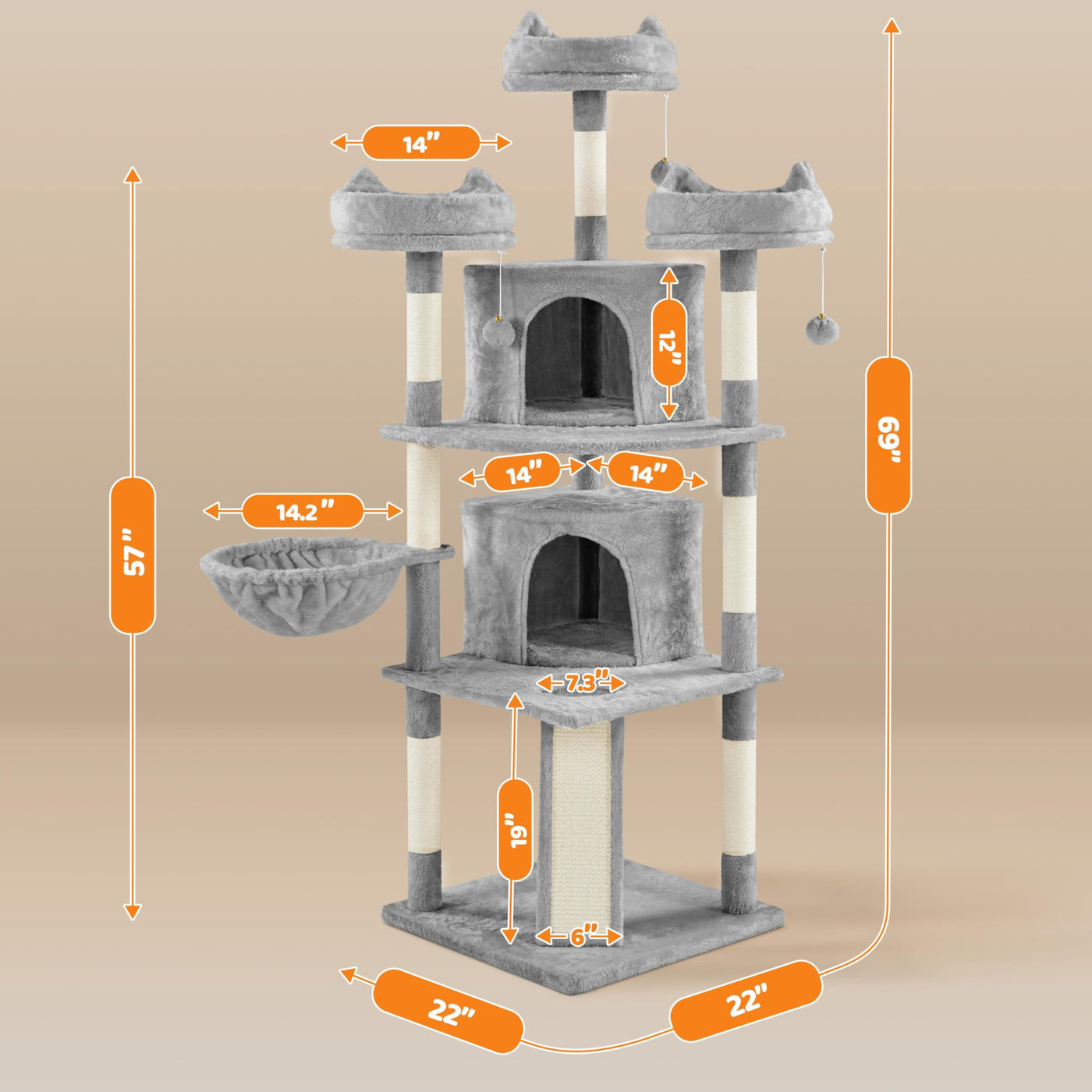 Funny Comfy Perches: The three top perches of the cat tree feature an adorable cat ear design, adding a playful touch. To enhance interest, the edges of the perches are adorned with plush dangling balls that can be easily removed or replaced | Protection for Your Furniture: Having this attractive cat tower at home, your cats might not scratch your sofa/bed anymore. This cat tower has several scratching posts and a scratching board for your cats to sharpen their little claws | For More Than One Cat Home: This professional cat tree has three perches with raised edges, two fan-shaped condos, one plush basket, one scratching board, seven scratching posts, and three dangling balls. This multifunctional cat tree is suitable for two or three normal-sized cats or several kittens | Double Stability: Place the cat tree on a flat surface and position it in a corner or against a wall to enhance stability. For added protection, it includes an anti-toppling kit, allowing secure wall-mounting | Nice Furniture: This extra-large cat tree, complete with multi-levels and charming cat-ear-shaped perches, not only brings comfort and joy to your cats but also serves as a stylish addition to your home decor