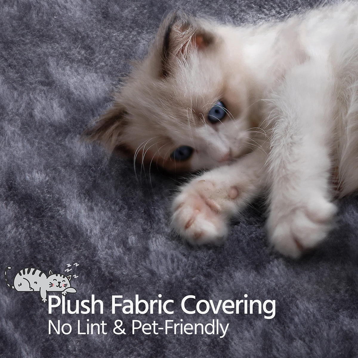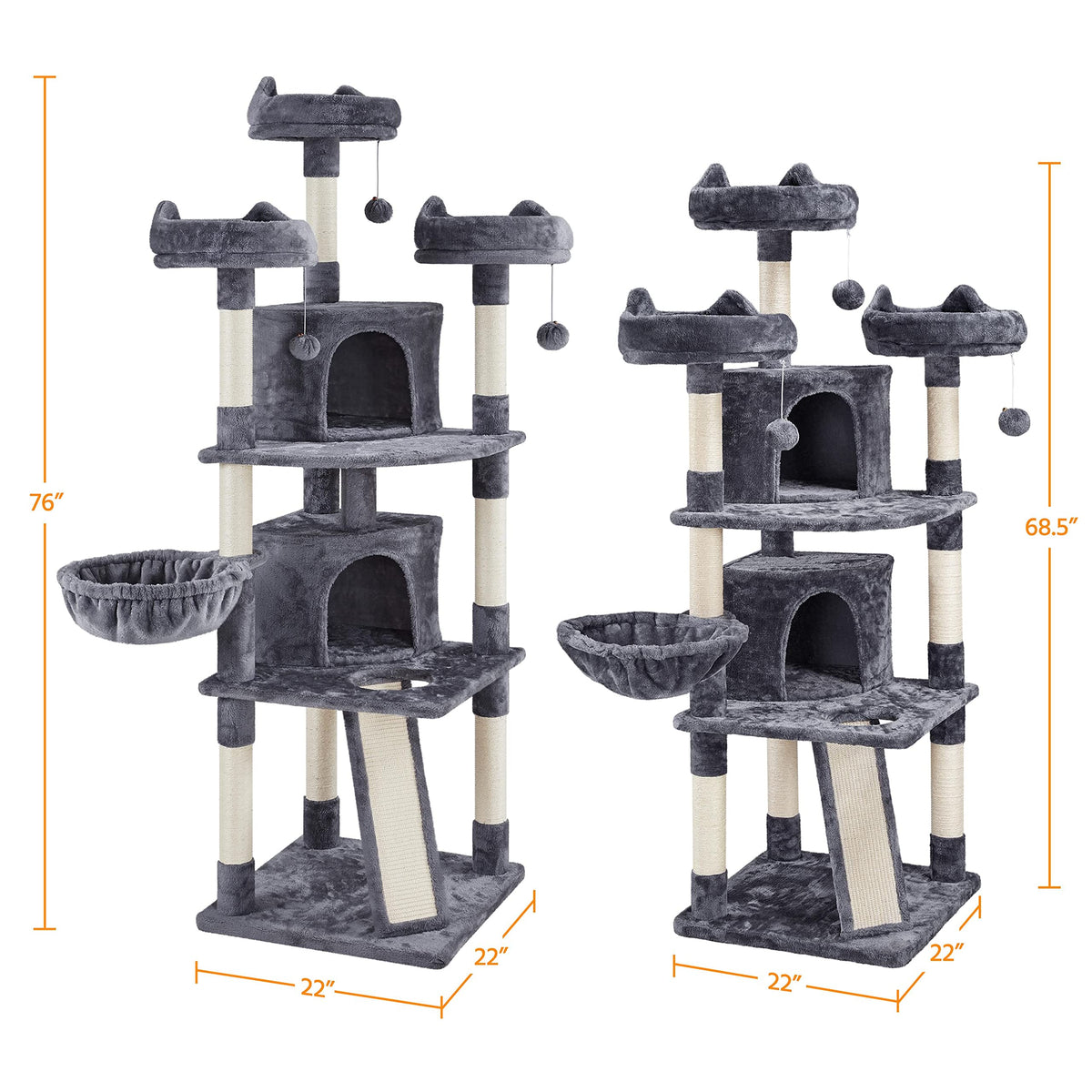 Quick overview:Are you looking for an ideal cat tree for your cats? Try this large plush cat tree. It won't let you and your cats down! Our large cat tower has a pretty appearance and reasonable layout. It can fully meet your cats' needs for playing and sleeping and exercising. Three perched platforms at the top are designed to look funny like cats' ears, cute, and interesting. Simple assembly is required and a detailed manual is included. Do not miss this quality cat tree!Specifications:Material: particleboard, plush, sisal ropeColor: dark grayOverall size: 22'' L x 22'' W x 76'' HCondo size: 14'' L x 14'' W x 12''HDiameter of perch with raised edge:14''Ladder size:21.5'' L x 6'' WDiameter of the basket:14.4''Max. weight capacity of basket/perch/condo: 11lb