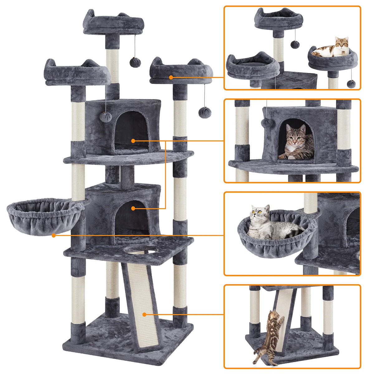 Q: How many scratching posts does the cat tree have?A: The Yaheetech Large Cat Tree features a total of 8 scratching posts. This variety allows your cats to scratch and sharpen their claws, helping to keep your furniture safe and promoting healthy scratching behavior.