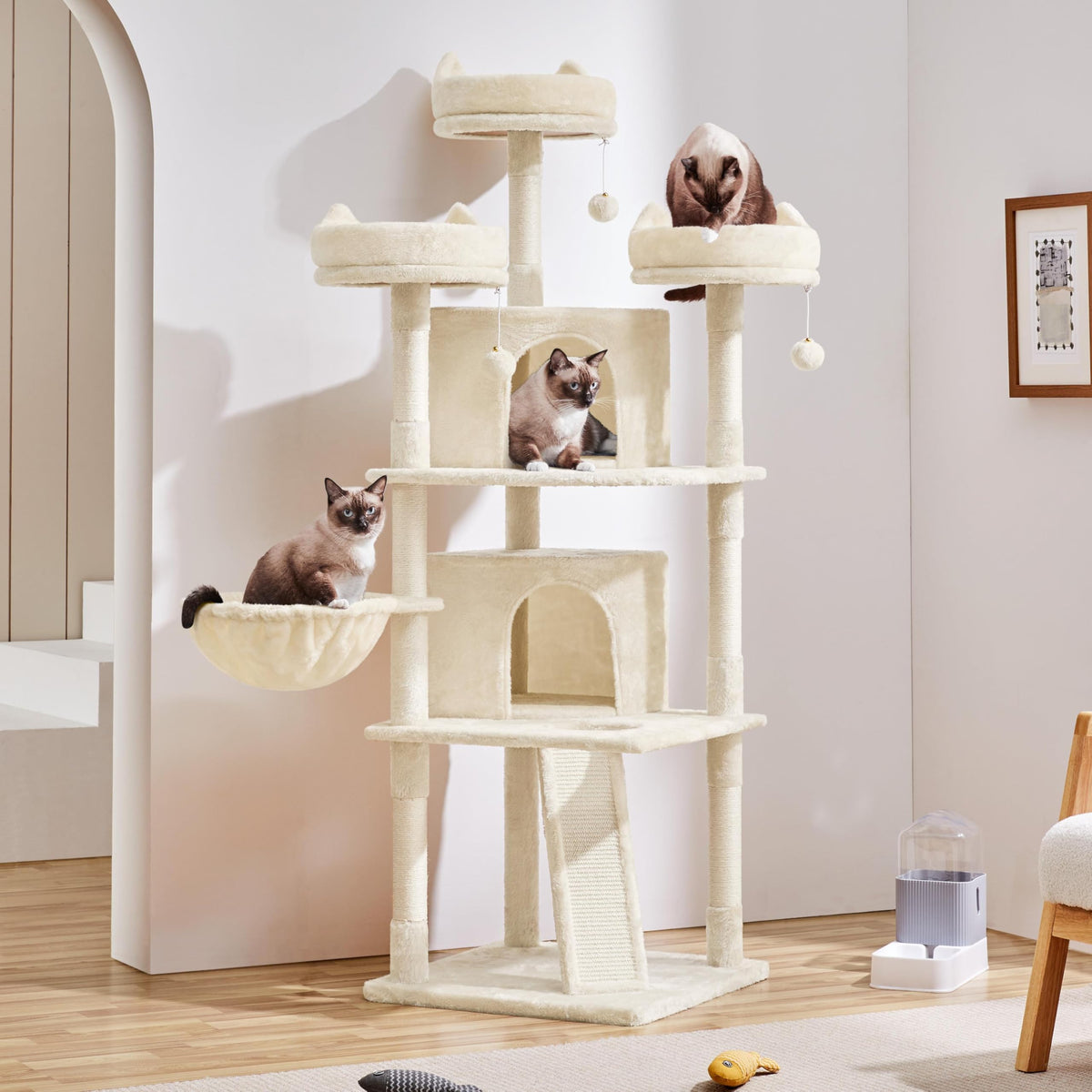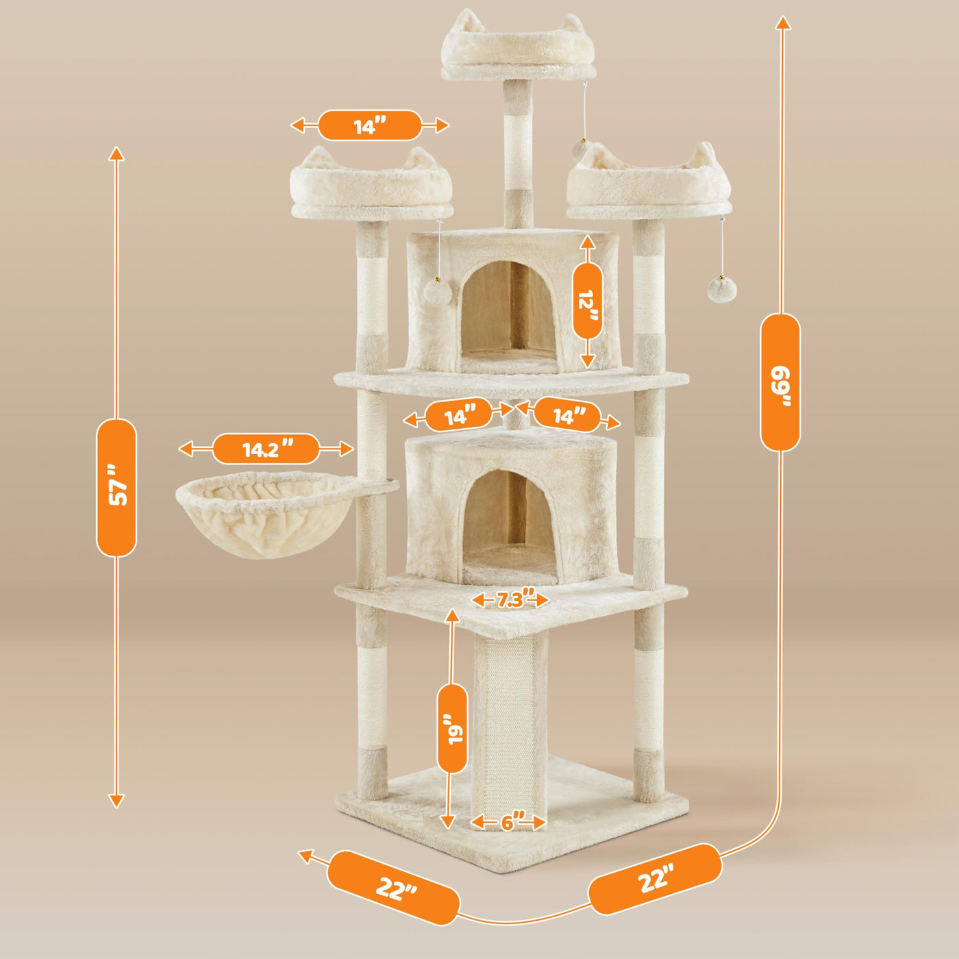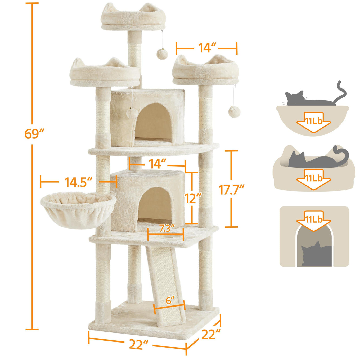 Quick overview:Are you looking for an ideal cat tree for your cats? Try this large plush cat tree. It won't let you and your cats down! Our multiple-level cat tower is made from durable soft materials, particleboard, plush. Our large cat tower has a pretty appearance and reasonable layout. It can fully meet your cats' needs for playing and sleeping and exercising.Specifications:Material: particleboard and plushColor: BeigeOverall size: 22x22x69inch (LxWxH); diameter of the basket: 14.4inch; scratching board size: 19x6inch (LxW); condo size: 14x14x12inch (LxWxH); the max. weight capacity of basket/perch/condo: 11lb; G.W.: 45lb; N.W.: 42lbNote:1. Please allow 1cm/0.5inch error due to manual measurement.