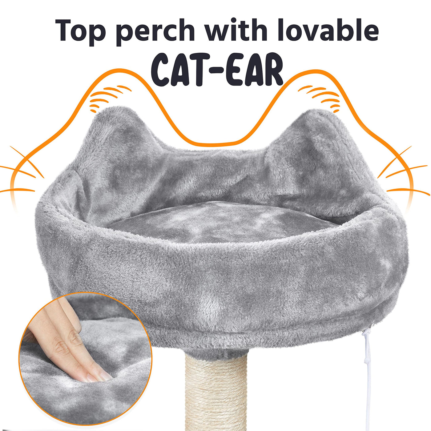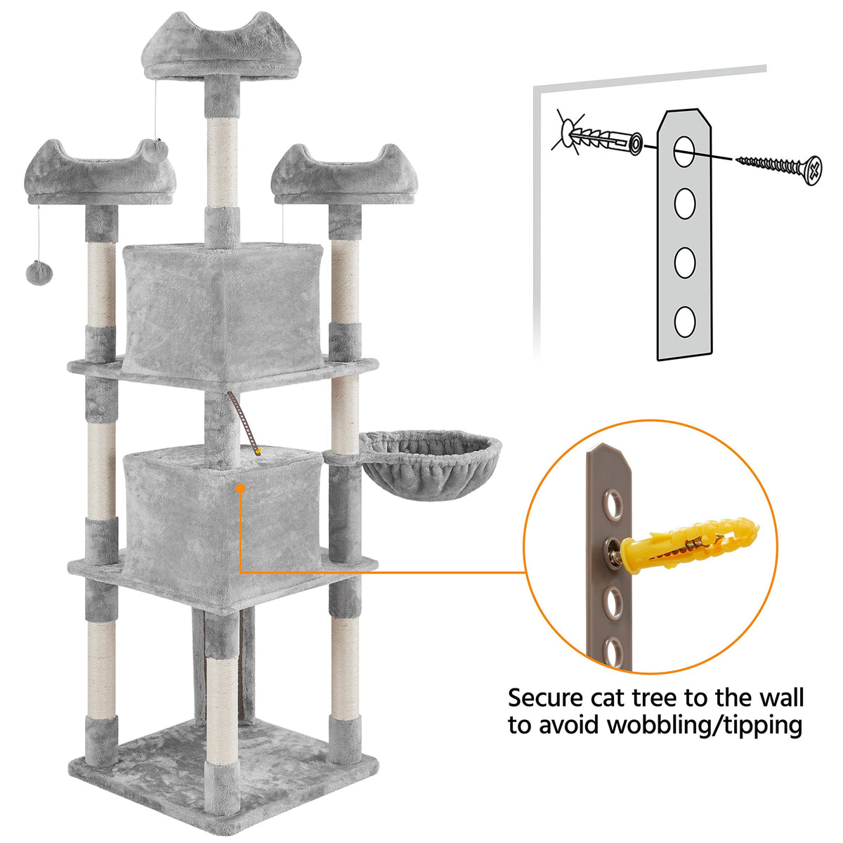 Quick overview:Are you looking for an ideal cat tree for your cats? Try this large plush cat tree. It won't let you and your cats down! Our large cat tower has a pretty appearance and reasonable layout. It can fully meet your cats' needs for playing and sleeping and exercising. Three perched platforms at the top are designed to look funny like cats' ears, cute, and interesting. Simple assembly is required and a detailed manual is included. Do not miss this quality cat tree!Specifications:Material: particleboard, plush, sisal ropeColor: light grayOverall size: 22'' L x 22'' W x 76'' HCondo size: 14'' L x 14'' W x 12''HDiameter of perch with raised edge:14''Ladder size:21.5'' L x 6'' WDiameter of the basket:14.4''Max. weight capacity of basket/perch/condo: 11lb