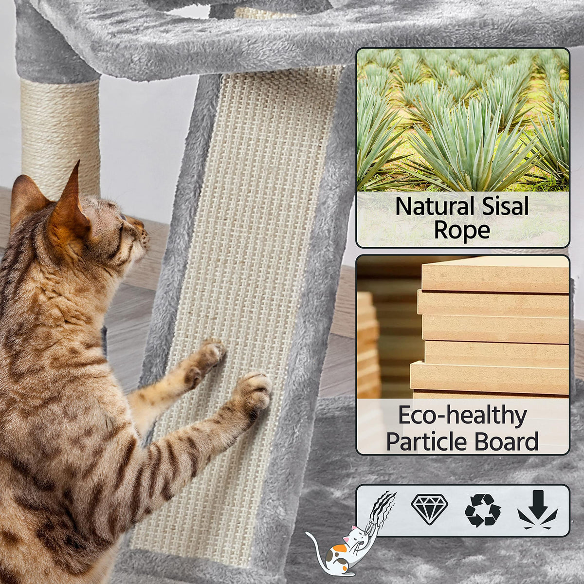 Q: What materials is the cat tree made of?A: The cat tree is constructed from particleboard and plush fabric, with scratching posts covered in natural sisal rope, ensuring durability and comfort for your cats.