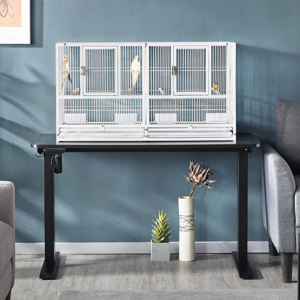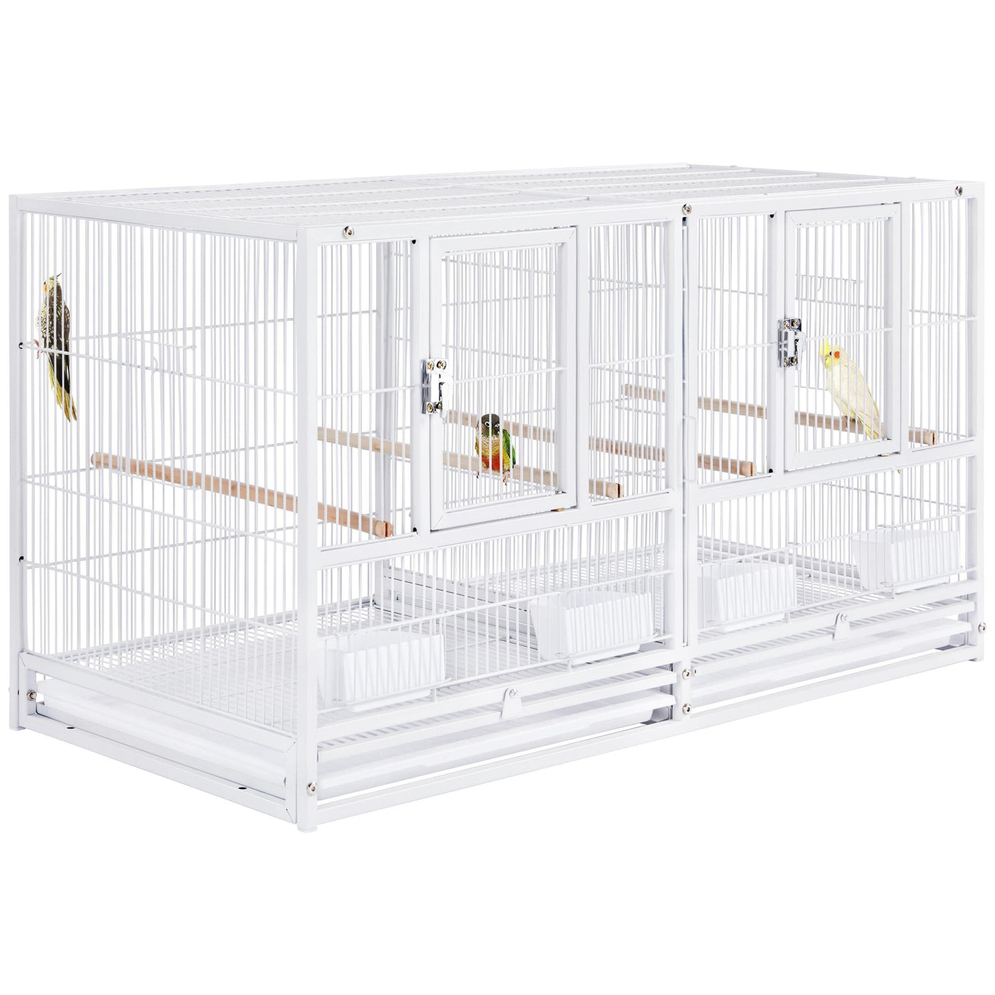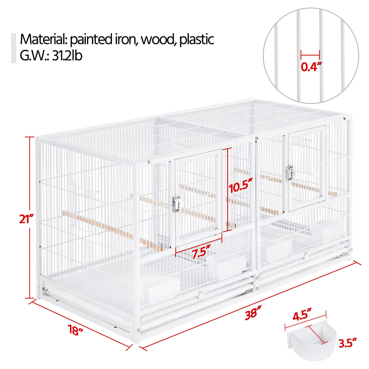 Quick overview:This 18 inches wide divided breeder cage coated with water-resistant hammered paint sports wrought metal construction and pet-parent friendly features. With the removable dividing grate, you can create two individual smaller bird cages or a large birdcage for more flexibility. The cage measures 37.6 long, 18 wide, and 21 tall with 0.4 wire spacing, which is perfect for housing 3-4 small birds such as lovebirds, canaries, finches, parakeets, cockatiels, Caiques, Quaker parrots, green cheeks, budgies. The stackable design can make full use of the space. Assemble is required.Specifications:Color: hammered whiteMaterial: painted steel, polypropylene, woodBar spacing: 0.4Cage dimension: 38x18x21 (LxWxH)Door: 7.2x10.2 (WxH)G.W.: 31.2lbPackage includes: 1 breeder cage, 4 cups, 4 perchesNote: Please allow 0.5 errors due to manual measurements.