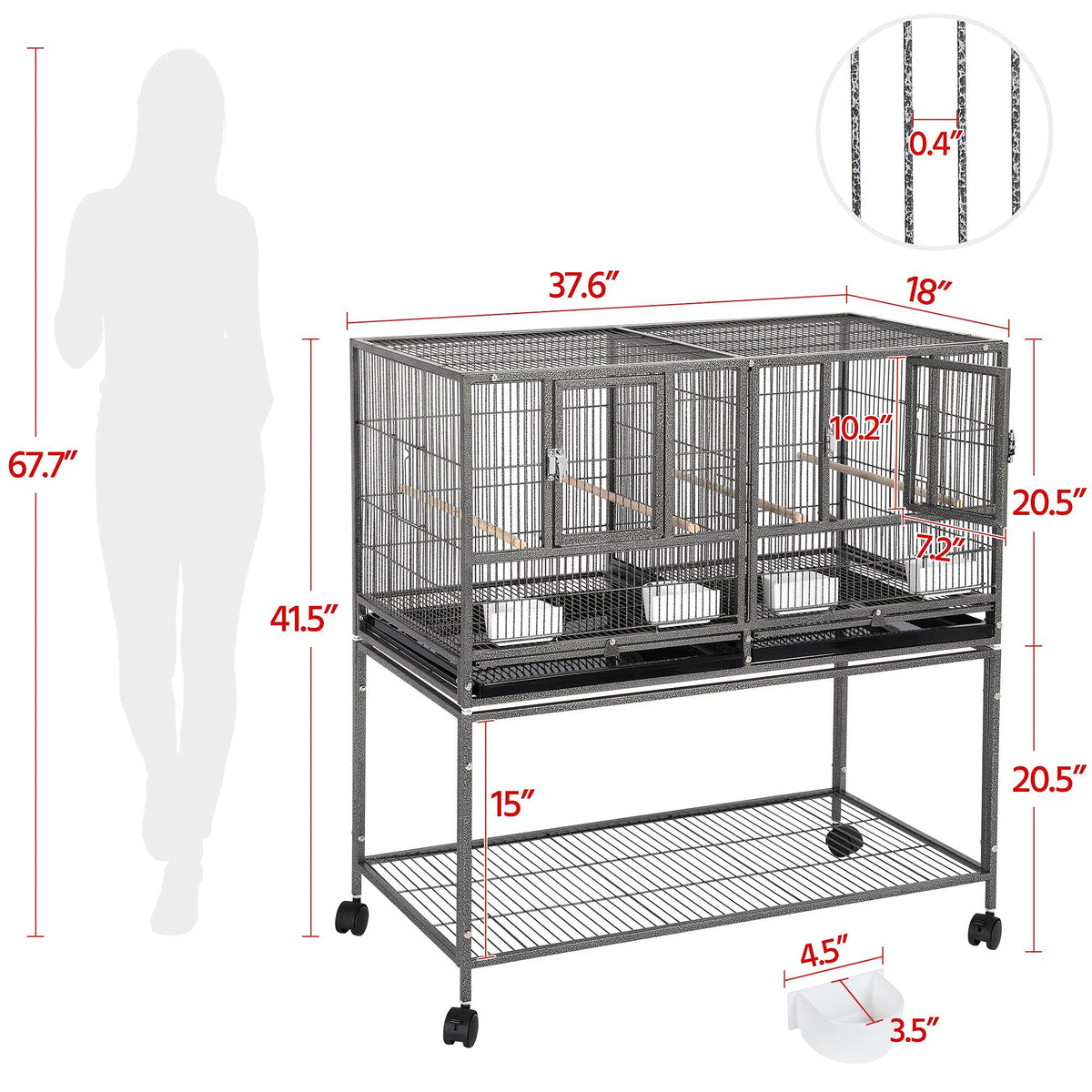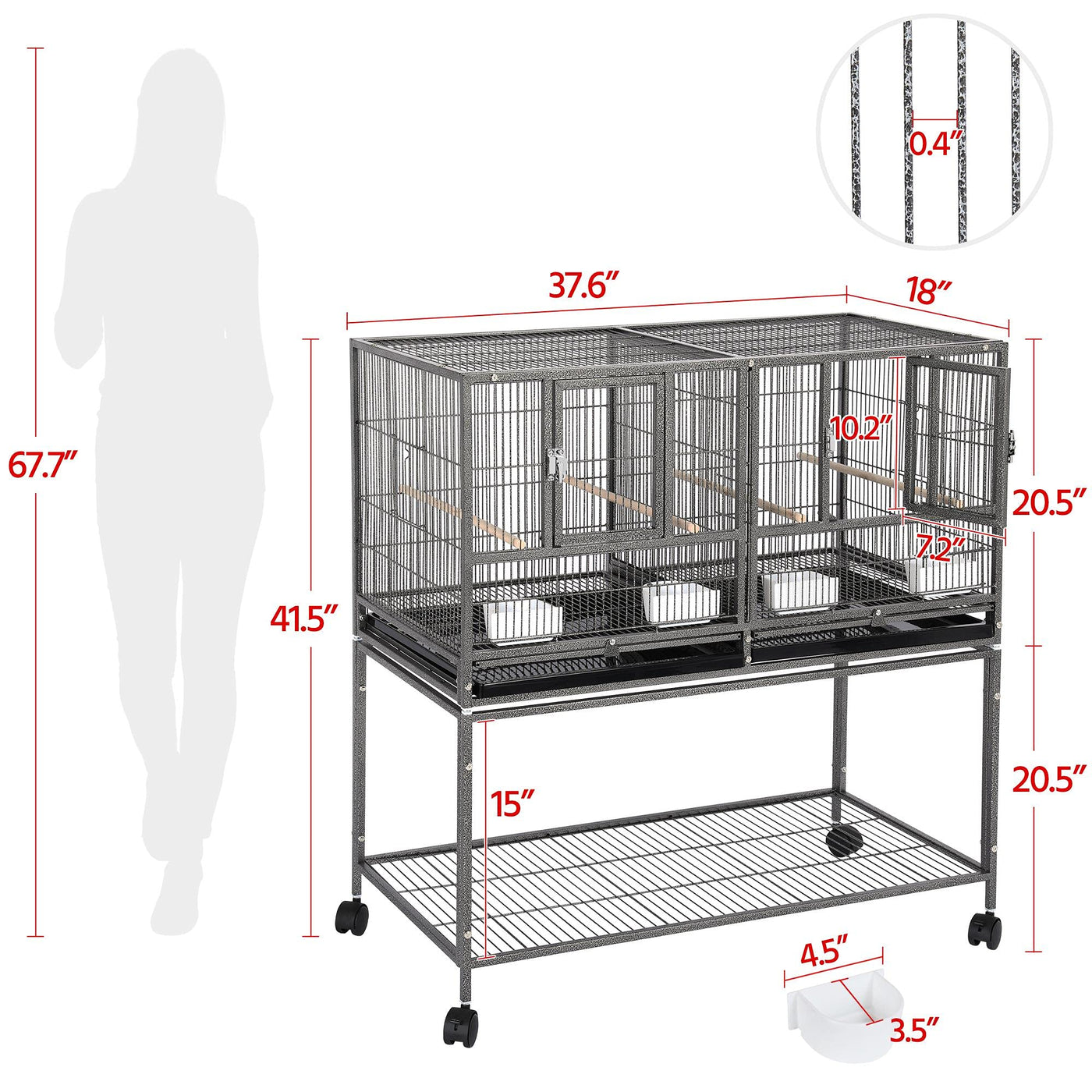 Divided Breeding Cage: The dividing grate helps divide this wide bird cage into two individual breeding/living spaces for housing two or more birds. Each bird cage system contains 2 perches, 2 feeders, a front door with lock, a side nesting door, pull-out tray and grate | Ideal for Small Birds: This divided breeder cage measures 37.6