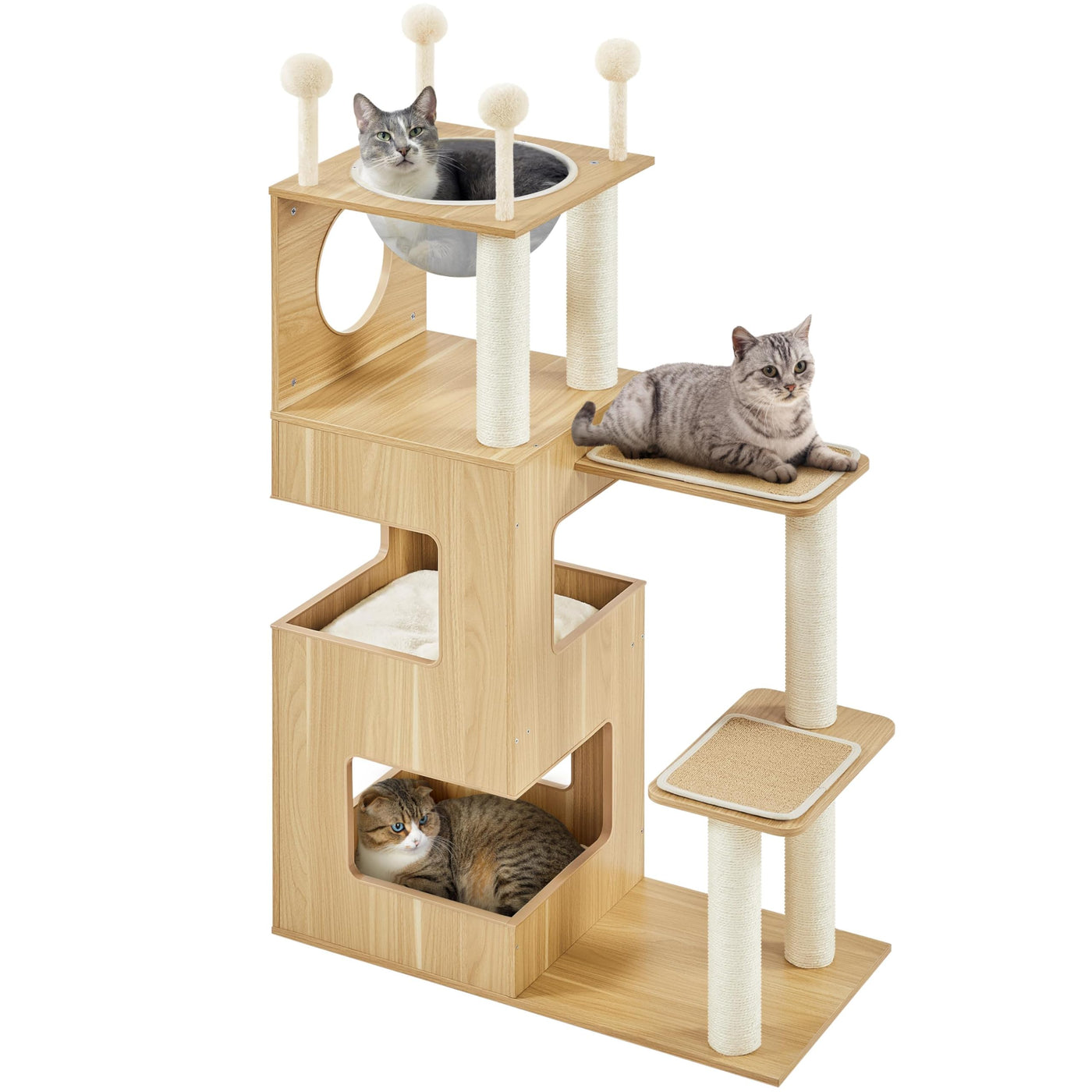 Yaheetech Wooden Cat Tree, 53In Modern Cat Tower For Indoor Cats With Scratching Posts Washable Detachable Cushion, Clear Bowl &