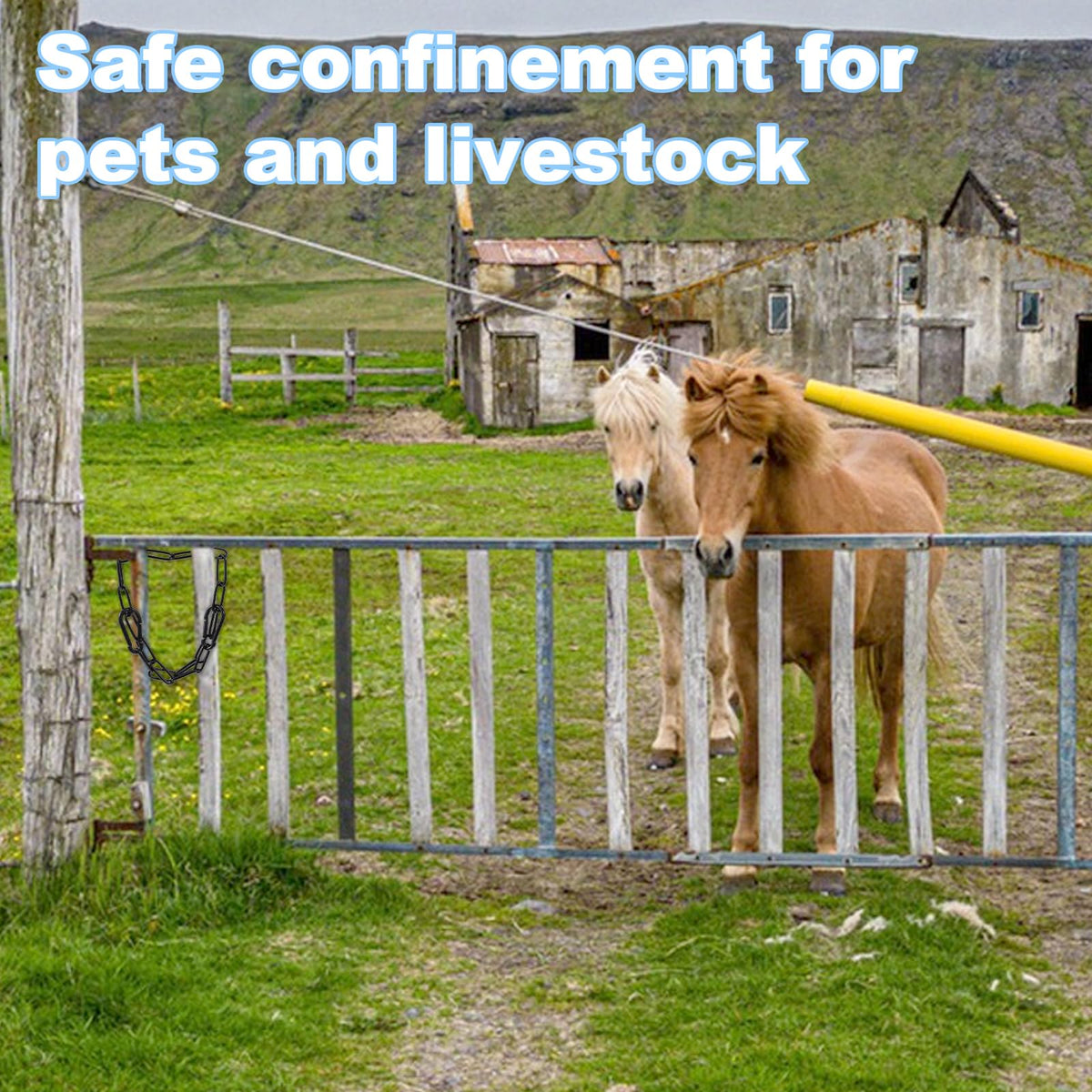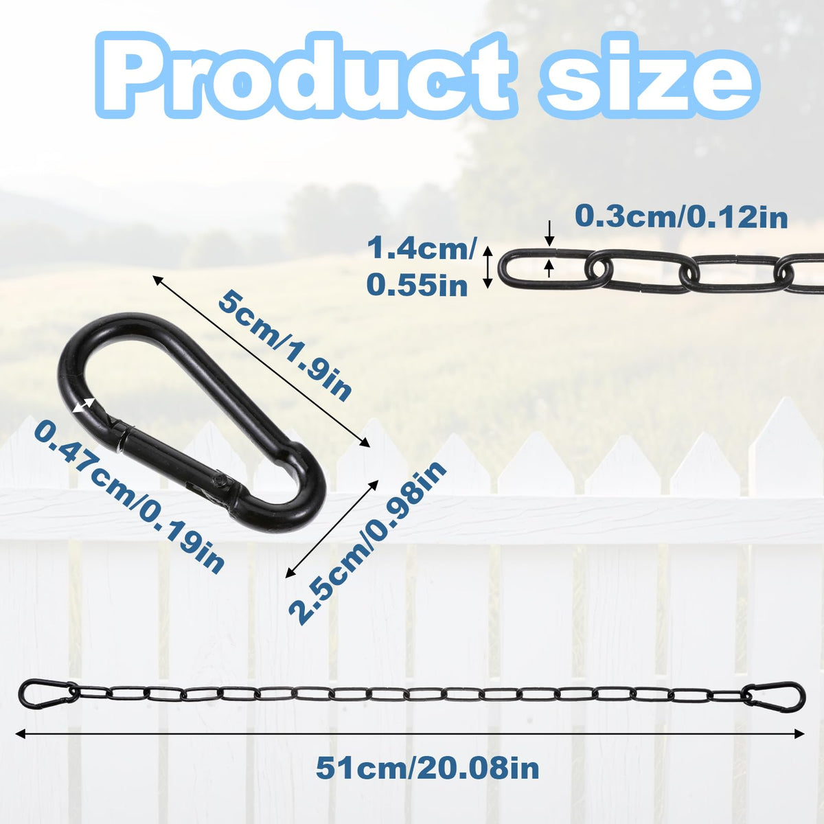 YBEATY Gate Chain Lock Hanging Chains Fence Lock Safety Gate Chain Link with Carabiner Easy to Adjust for Home Outdoor Camping Yards Pet Cages Horse Goat Dog Stall Barn and Fence GatesSpecifications:Category: Gate ChainColor: BlackMaterial: IronFunction: Widely used for fence gates, pet cage doors, yard doors or outdoor activities (such as hammocks, swings, pull-up equipment)Product size:Chain: 20.08 0.55 0.12 inches/51 1.4 0.3 cmCarabiner: 1.97 0.98 0.19 inches/5 2.5 0.47 cmPacking list: 1 pcs Gate Chain1.This chain lock for gate has adjustable length, easily adaptable to various gate sizes and security requirements2.Sturdy carabiner and strong chain structure prevent accidental escape, ensuring your animals safety3.This outdoor chain lock has a smooth surface and simple design, adding a modern touch to the door, making it an ideal door decoration accessory