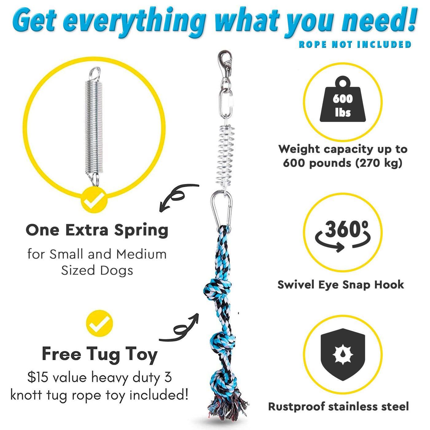 “Want Your Dog To Be Happy And Healthy? Looking For Crazy Durable & Safe Spring Pole (Exercise Equipment for Dogs)? Be Wary Of Imitators…Get The Real Thing Here!”YES4Quality Spring Pole is considered the best muscle building exercise tool for dogs, providing countless hours of fun. The spring pole simulates the tug-o-war game. Dog’s are naturally challenged by this game, because they love the pulling, swinging, and tugging action that the spring pole provides.Top Benefits Why Our Spring Pole Is The One For you!1) 2 Springs of Different Weight Capacity Included - You can choose from and use the spring that fits your dog size. It’s what makes our springpole perfect for dogs of all ages and breeds.2) Extra Durable - designed to hold up to 600 lbs (270 kg) and tested for 30 tugging sessions (30 minutes each)3) Easy to Install - hang from tree + rafter + porch beam, comes with detailed user manual4) $15.00 Premium Rope Toy Included - 23 inch longEasy to Install & Use:Step 1) Locate a place to mount the spring poleA strong tree branch is usually the easiest way to mount your spring pole. If a tree branch isn’t available, a wood beam would be the next best choice.Step 2) Install a hanger for the spring poleTree branch method: Tie a rope to the branch. The rope will act as your hanger for the rest of the parts. The bottom of this rope should be roughly 5 feet from the ground.Wood beam method: Make sure to use durable wood beam hanger.Step 3) Connect the spring pole with the hanger & attach the rope toyStep 4) Introduce your dog to the spring pole and have fun!** Click [Add to Cart] ** to foster a strong relationship between you and your dog, AND keep more money in your pocket by avoiding spending money on products that don’t work…a real win-win!