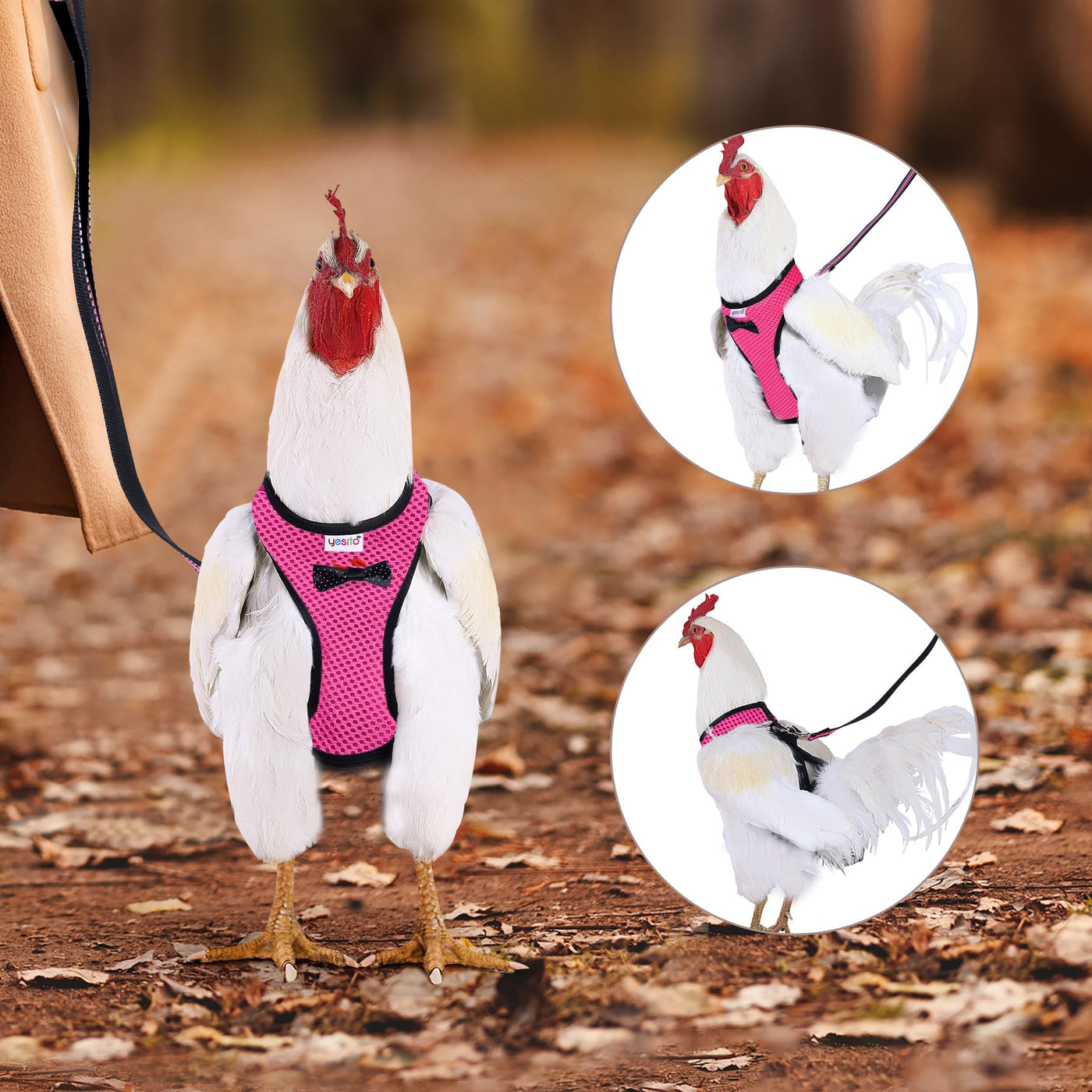 Q: Can I take my chicken for a walk with this harness?A: Yes, the Yesito Chicken Harness allows you to take your chicken for a walk. It includes a 6ft matching leash that provides ample length for comfortable walking while keeping your feathered friend safe and close.