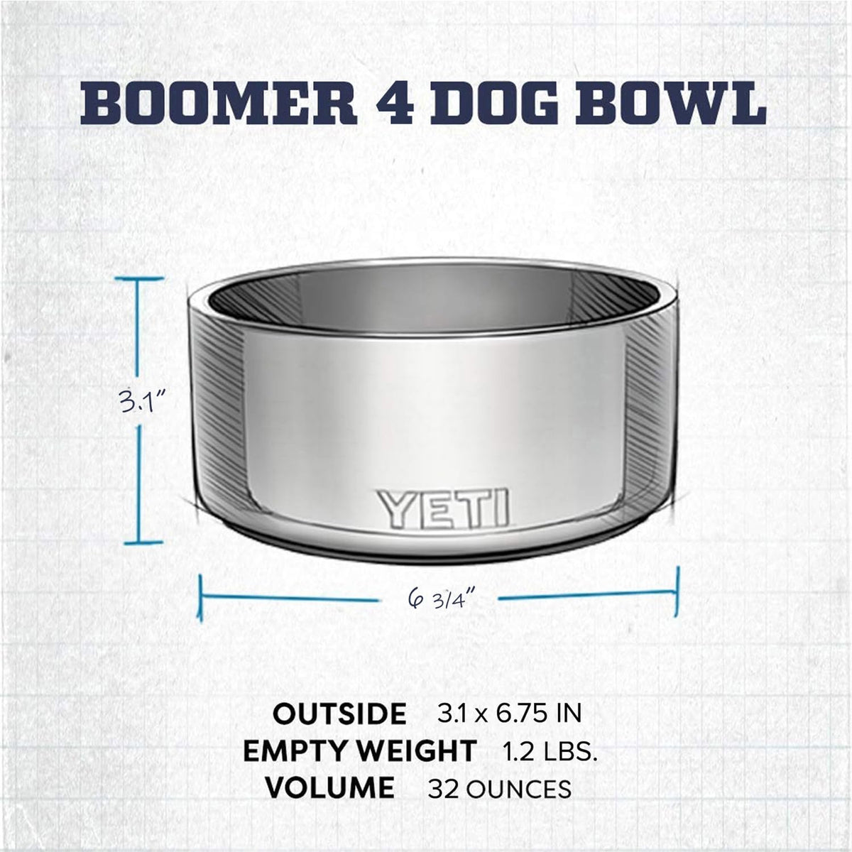 Dinner Is Servedafter A Day Full Of Exploring, Your #1 Deserves Hearty Hydration And A Bowl Full Of Satisfying Sustenance, Best Served In Boomer. This Extra-Strong Dog Bowl Resists Dents And Dings In And Outdoors, While Streamlined Design Makes It Easy Take In Tow. Its The Dog Bowl Theyd Choose To Snack, Sip, And Slurp Out Of.Technology & Featuresfor Added Convenience, The Bearfoot Non-Slip Ring On The Bottom Ensures It Wont Slip And Slide Across The Floor - No Matter How Enthusiastically Your Canine Chows Down. Most Importantly, Its Bpa-Free So You Can Fill Boomer To The Brim With Four Cups Of Fresh Water, Tasty Treats, Or The Worlds Best Kibble.A Yeti Dog Bowl Designed To Be As Dependable And Adventurous As Your Best Friend. It Holds Four Cups Of Refreshing Water And Tasty Treats, And Built With Double-Wall, Non-Insulated Stainless Steel Making It Incredibly Durable, Easy To Clean, And Resistant To Rust And Roughhousing. When Theyve Successfully Licked Boomer Clean, Just Throw It In The Dishwasher, Because Time Is Better Spent On The Boat, Duck Hunting, Or Exploring New Trails Together.