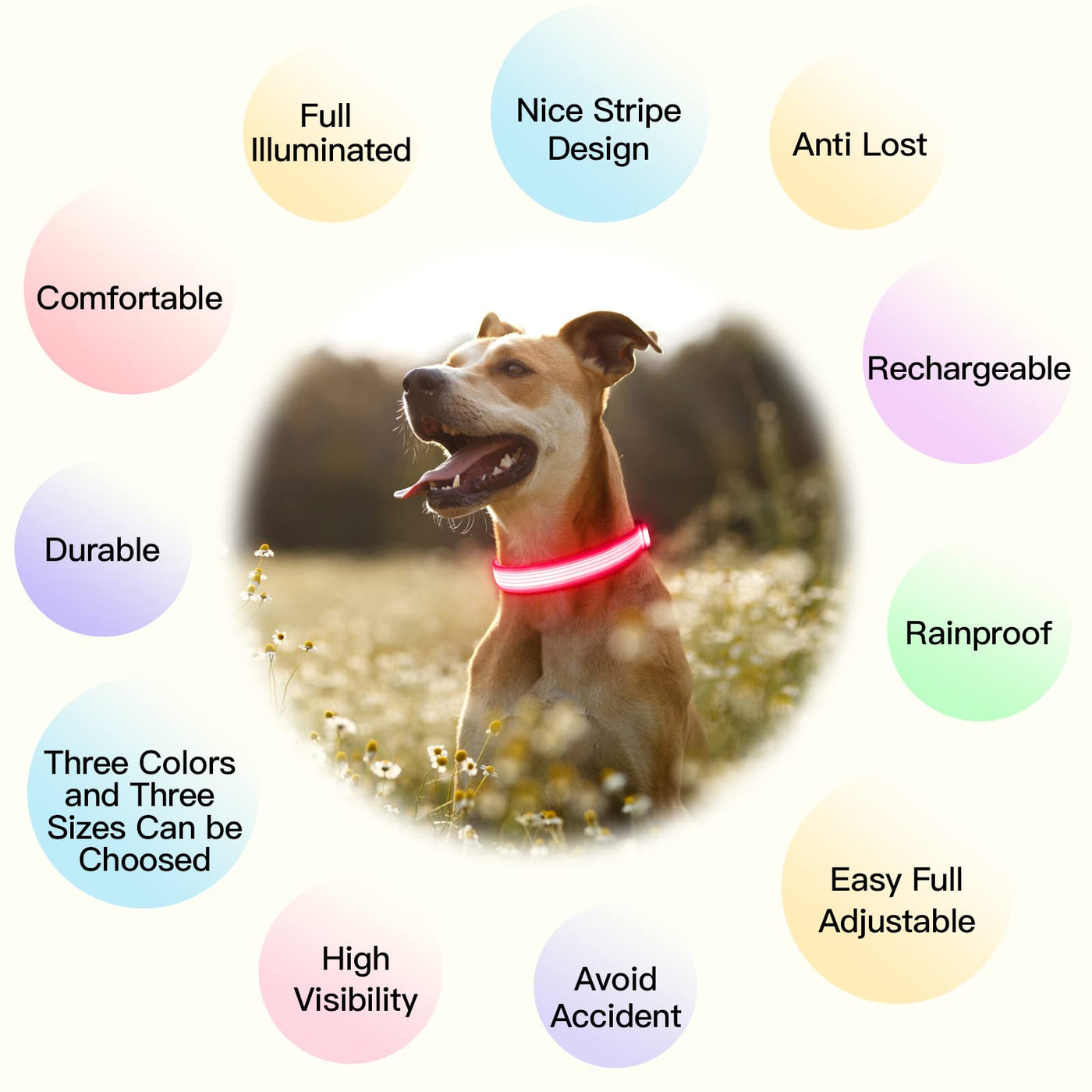 The Story Of Us:I Am A Pet Lover And Have 2 Dogs (One Jacky One Tony) And 1 Dog (Nikky). And I Have An Idea To Do Best Product For Them, Also For Your Pet.Before The Product Launches, I Will Let My Pets Try This Product To Ensure Product Quality. So You Dont Have To Worry About The Safety Of The Product, My Pets Use This Product Every Day.We Aiming At Bringing The Best Products And Services To All Pets !Are You Worried About Your Loved Pet Are Safe At Night And Frustrated Some Pet Necklace Loop Dont Fit Their Size?---Our Adjustable Sizes Item Light Up Dog Collar Can Help You Get Rid Of These Troubles!What Can You Get From Our Light Up Dog Collar?1). Specification For Light Up Dog Collar---Three Flashing Modes: Quick Flashing-Slow Flashing-Stable Glow-Off, Changing The Flash Modes Just By Click The Button On The Batter Case.---Three Available Color Options: Red, Green, Pink, Blue.---Size: Samll:26.6~35.5Cm, Medium: 35.5~52Cm, Large:43.2~65Cm.2) Package Including For Light Up Dog Collar---1X Light Up Dog Collar---1X Usb Charge Cabletips Of How To Use This Light Up Dog Collar? 1. Youd Better Get It Be Fully Charged After First Use Up Of The Battery, Which Will Promote The Service Life Of The Battery For Collar.2. Measuring The Length Of Your Dogs, And Adjust The Buckle Of The Collar And Let It Fit Your Pets, And Fixed It.3. Choose The Flash Mode That You Need, And Turn It Off When Not Needed. Warning:1.Choking Hazard Small Parts, Not For Children Under 3 Years Old.2.Fast Charge Adapter May Cause Serious Damage. Charging With 5V Usb Adapter Only.3.The Color Of The Picture May Vary Depending On The Display. Please Refer To The Actual Object.